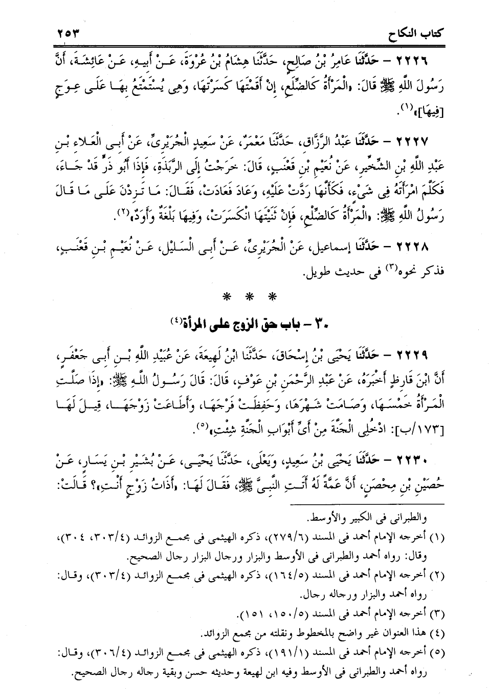 2230 - حَدَّثَنَا يَحْيَى بْنُ سَعِيدٍ، وَيَعْلَى، حَدَّثَنَا يَحْيَى، عَنْ بُشَيْرِ بْنِ يَسَارٍ، عَنْ حُصَيْنِ بْنِ مِحْصَنٍ، أَنَّ عَمَّةً لَهُ أَتَتِ النَّبِىَّ صلى الله عليه وسلم، فَقَالَ لَهَا: "أَذَاتُ زَوْجٍ أَنْتِ؟ قَالَتْ: -[254]- نَعَمْ، قَالَ: "فَأَيْنَ أَنْتِ مِنْهُ؟ قَالَ يَعْلَى: قَالَتْ: مَا آلُوهُ إِلاَّ مَا عَجَزْتُ عَنْهُ، قَالَ: "فَكَيْفَ أَنْتِ لَهُ، فَإِنَّهُ جَنَّتُكِ وَنَارُكِ.