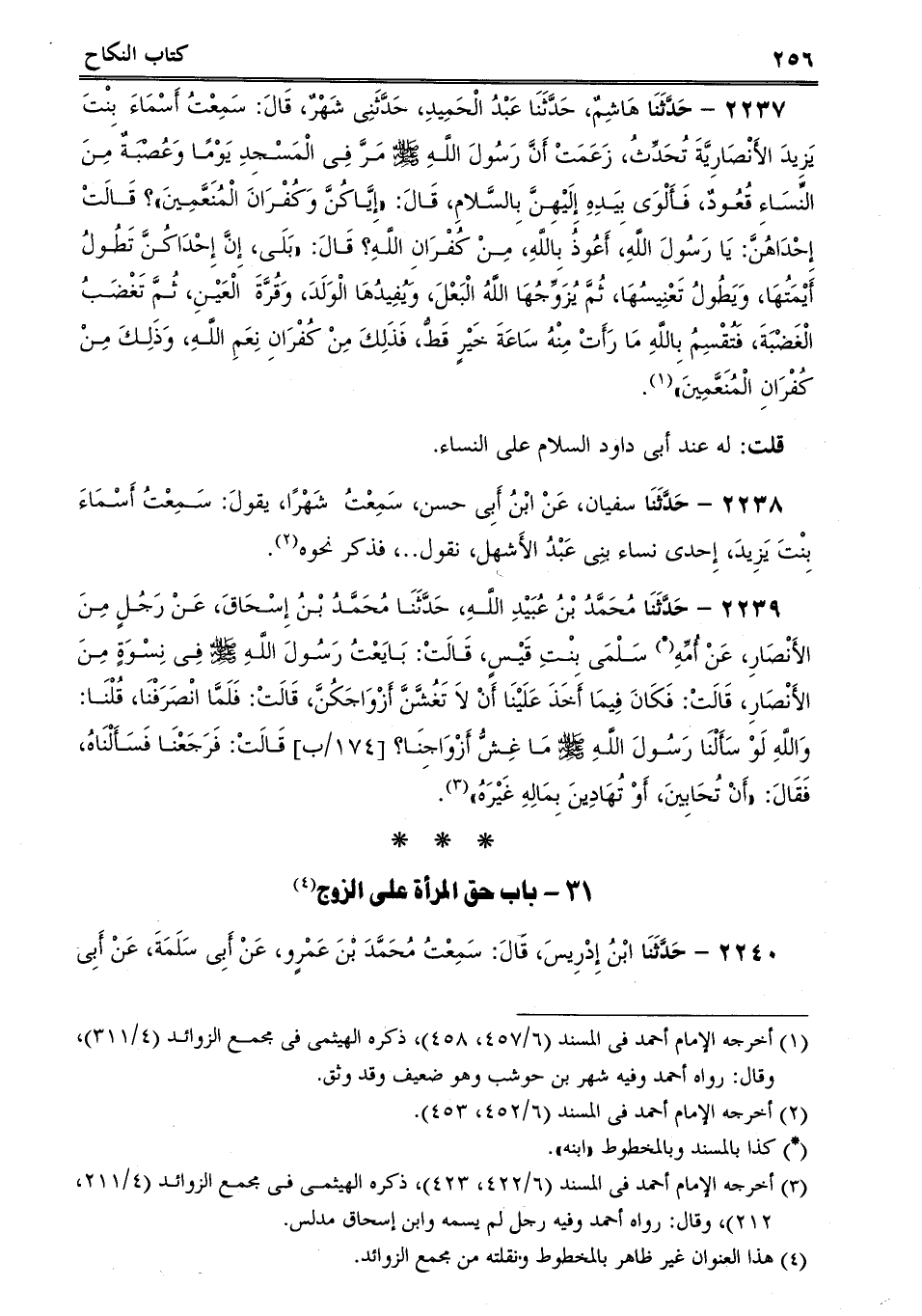 2237 - حَدَّثَنَا هَاشِمٌ، حَدَّثَنَا عَبْدُ الْحَمِيدِ، حَدَّثَنِى شَهْرٌ، قَالَ: سَمِعْتُ أَسْمَاءَ بِنْتَ يَزِيدَ الأَنْصَارِيَّةَ تُحَدِّثُ، زَعَمَتْ أَنَّ رَسُولَ اللَّهِ صلى الله عليه وسلم مَرَّ فِى الْمَسْجِدِ يَوْمًا وَعُصْبَةٌ مِنَ النِّسَاءِ قُعُودٌ، فَأَلْوَى بِيَدِهِ إِلَيْهِنَّ بِالسَّلامِ، قَالَ: "إِيَّاكُنَّ وَكُفْرَانَ الْمُنَعَّمِينَ؟ قَالَتْ إِحْدَاهُنَّ: يَا رَسُولَ اللَّهِ، أَعُوذُ بِاللَّهِ، مِنْ كُفْرَانِ اللَّهِ؟ قَالَ: "بَلَى، إِنَّ إِحْدَاكُنَّ تَطُولُ أَيْمَتُهَا، وَيَطُولُ تَعْنِيسُهَا، ثُمَّ يُزَوِّجُهَا اللَّهُ الْبَعْلَ، وَيُفِيدُهَا الْوَلَدَ، وَقُرَّةَ الْعَيْنِ، ثُمَّ تَغْضَبُ الْغَضْبَةَ، فَتُقْسِمُ بِاللَّهِ مَا رَأَتْ مِنْهُ سَاعَةَ خَيْرٍ قَطُّ، فَذَلِكَ مِنْ كُفْرَانِ نِعَمِ اللَّهِ، وَذَلِكَ مِنْ كُفْرَانِ الْمُنَعَّمِينَ.