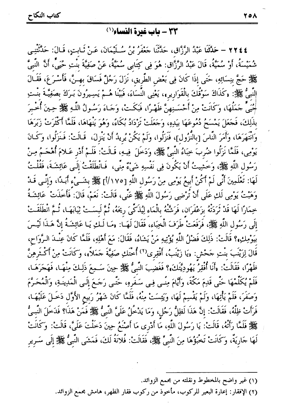 2244 - حَدَّثَنَا عَبْدُ الرَّزَّاقِ، حَدَّثَنَا جَعْفَرُ بْنُ سُلَيْمَانَ، عَنْ ثَابِتٍ، قَالَ: حَدَّثَتْنِى شُمَيْسَةُ، أَوْ سُمَيَّةُ، قَالَ عَبْدُ الرَّزَّاقِ: هُوَ فِى كِتَابِى سُمَيَّةُ، عَنْ صَفِيَّةَ بِنْتِ حُيَىٍّ، أَنَّ النَّبِىَّ صلى الله عليه وسلم حَجَّ بِنِسَائِهِ، حَتَى إِذَا كَانَ فِى بَعْضِ الطَّرِيقِ، نَزَلَ رَجُلٌ فَسَاقَ بِهِنَّ، فَأَسْرَعَ، فَقَالَ النَّبِىُّ صلى الله عليه وسلم: "كَذَاكَ سَوْقُكَ بِالْقَوَارِيرِ، يَعْنِى النِّسَاءَ، فَبَيْنَا هُمْ يَسِيرُونَ بَرَكَ بِصَفِيَّةَ بِنْتِ حُيَىٍّ جَمَلُهَا، وَكَانَتْ مِنْ أَحْسَنِهِنَّ ظَهْرًا، فَبَكَتْ، وَجَاءَ رَسُولُ اللَّهِ صلى الله عليه وسلم حِينَ أُخْبِرَ بِذَلِكَ، فَجَعَلَ يَمْسَحُ دُمُوعَهَا بِيَدِهِ، وَجَعَلَتْ تَزْدَادُ بُكَاءً، وَهُوَ يَنْهَاهَا، فَلَمَّا أَكْثَرَتْ زَبَرَهَا وَانْتَهَرَهَا، وَأَمَرَ النَّاسَ [بِالنُّزُولِ] ، فَنَزَلُوا، وَلَمْ يَكُنْ يُرِيدُ أَنْ يَنْزِلَ، قَالَتْ: فَنَزَلُوا، وَكَانَ يَوْمِى، فَلَمَّا نَزَلُوا ضُرِبَ خِبَاءُ النَّبِىِّ صلى الله عليه وسلم، وَدَخَلَ فِيهِ، قَالَتْ: فَلَمْ أَدْرِ عَلامَ أُهْجَمُ مِنْ رَسُولِ اللَّهِ صلى الله عليه وسلم، وَخَشِيتُ أَنْ يَكُونَ فِى نَفْسِهِ شَىْءٌ مِنِّى، فَانْطَلَقْتُ إِلَى عَائِشَةَ، فَقُلْتُ لَهَا: تَعْلَمِينَ أَنِّى لَمْ أَكُنْ أَبِيعُ يَوْمِى مِنْ رَسُولِ اللَّهِ صلى الله عليه وسلم بِشَىْءٍ أَبَدًا، وَإِنِّى قَدْ وَهَبْتُ يَوْمِى لَكِ عَلَى أَنْ تُرْضِى رَسُولَ اللَّهِ صلى الله عليه وسلم عَنِّى، قَالَتْ: نَعَمْ، قَالَ: فَأَخَذَتْ عَائِشَةُ خِمَارًا لَهَا قَدْ ثَرَدَتْهُ بِزَعْفَرَانٍ، فَرَشَّتْهُ بِالْمَاءِ لِيُذَكِّىَ رِيحَهُ، ثُمَّ لَبِسَتْ ثِيَابَهَا، ثُمَّ انْطَلَقَتْ إِلَى رَسُولِ اللَّهِ صلى الله عليه وسلم، فَرَفَعَتْ طَرَفَ