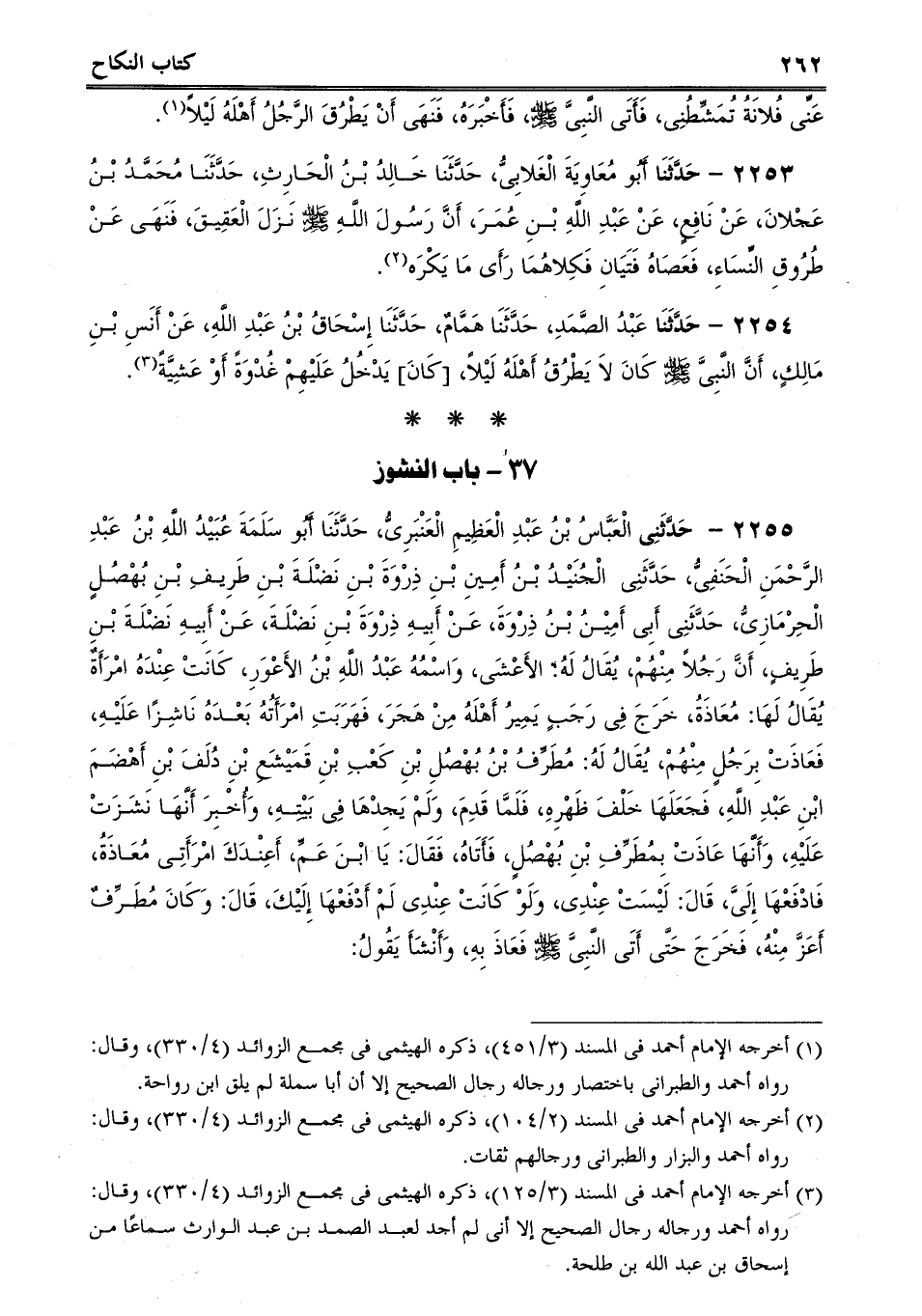 2253 - حَدَّثَنَا أَبُو مُعَاوِيَةَ الْغَلابِىُّ، حَدَّثَنَا خَالِدُ بْنُ الْحَارِثِ، حَدَّثَنَا مُحَمَّدُ بْنُ عَجْلانَ، عَنْ نَافِعٍ، عَنْ عَبْدِ اللَّهِ بْنِ عُمَرَ، أَنَّ رَسُولَ اللَّهِ صلى الله عليه وسلم نَزَلَ الْعَقِيقَ، فَنَهَى عَنْ طُرُوقِ النِّسَاءِ، فَعَصَاهُ فَتَيَانِ فَكِلاهُمَا رَأَى مَا يَكْرَه.