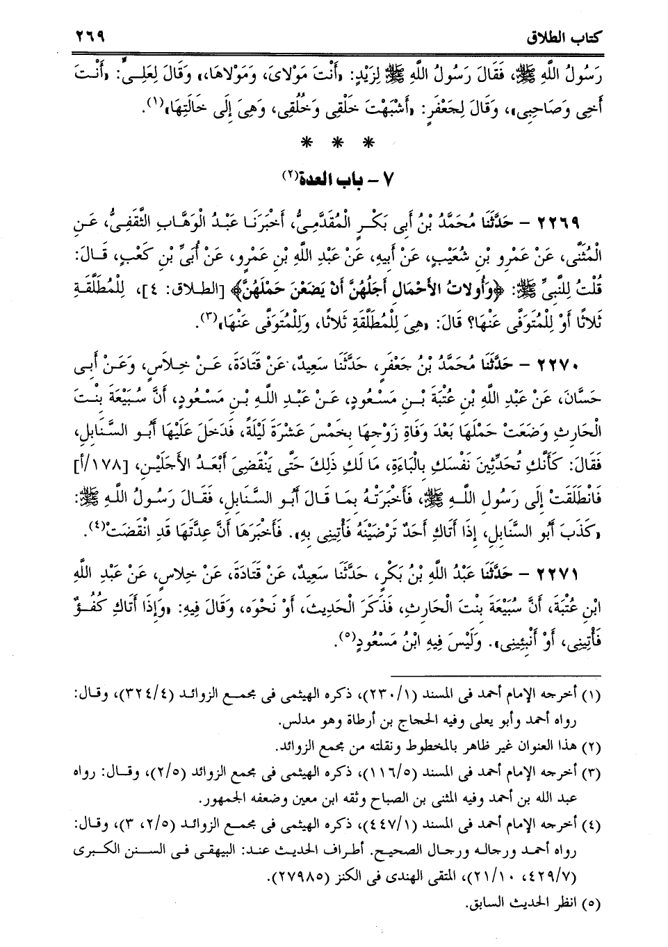 2269 - حَدَّثَنَا مُحَمَّدُ بْنُ أَبِى بَكْرٍ الْمُقَدَّمِىُّ، أَخْبَرَنَا عَبْدُ الْوَهَّابِ الثَّقَفِىُّ، عَنِ الْمُثَنَّى، عَنْ عَمْرِو بْنِ شُعَيْبٍ، عَنْ أَبِيهِ، عَنْ عَبْدِ اللَّهِ بْنِ عَمْرٍو، عَنْ أُبَىِّ بْنِ كَعْبٍ، قَالَ: قُلْتُ لِلنَّبِىِّ صلى الله عليه وسلم: {وَأُولاتُ الأَحْمَالِ أَجَلُهُنَّ أَنْ يَضَعْنَ حَمْلَهُنَّ} ، لِلْمُطَلَّقَةِ ثَلاثًا أَوْ لِلْمُتَوَفَّى عَنْهَا؟ قَالَ: "هِىَ لِلْمُطَلَّقَةِ ثَلاثًا، وَلِلْمُتَوَفَّى عَنْهَا.
