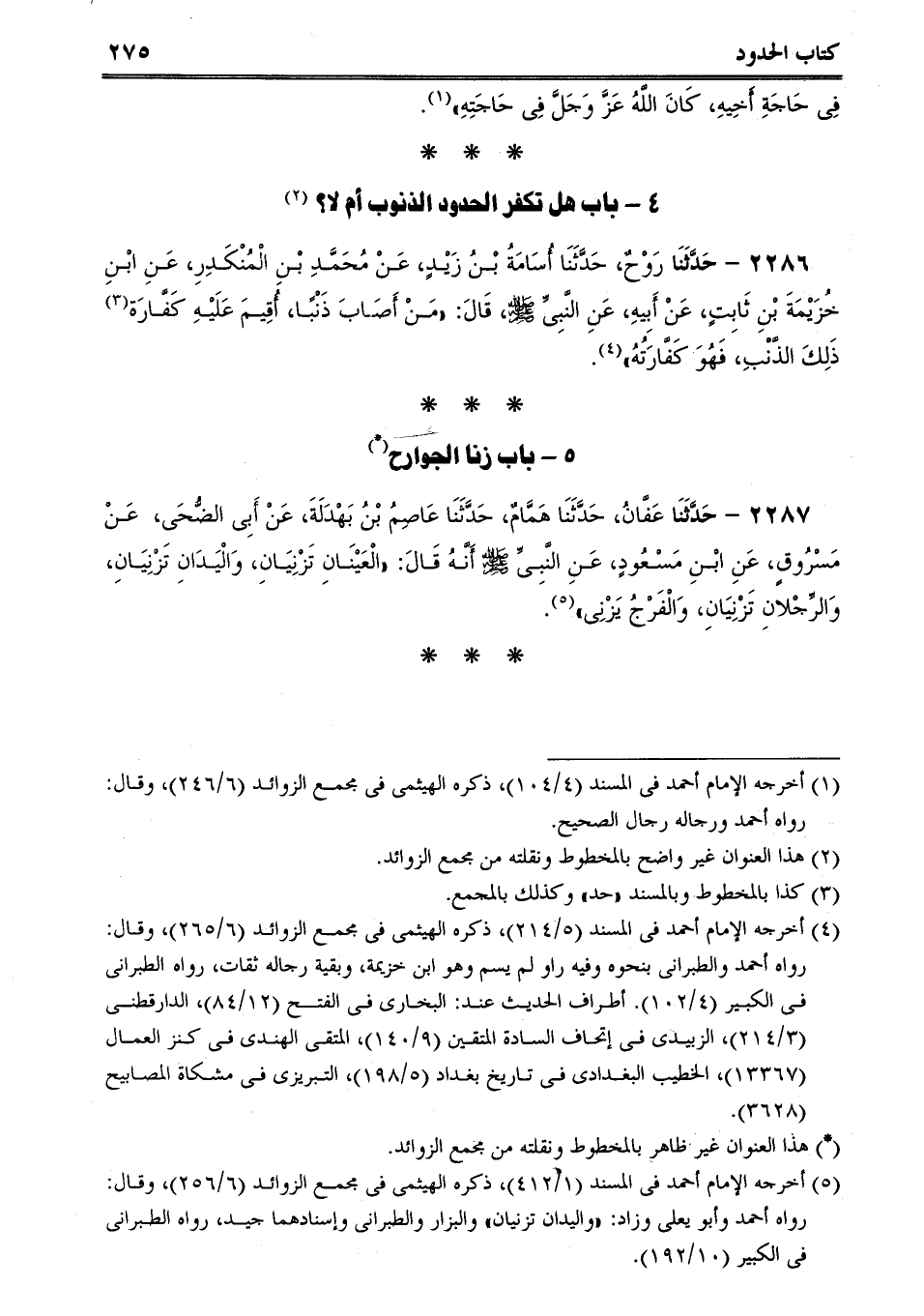 2286 - حَدَّثَنَا رَوْحٌ، حَدَّثَنَا أُسَامَةُ بْنُ زَيْدٍ، عَنْ مُحَمَّدِ بْنِ الْمُنْكَدِرِ، عَنِ ابْنِ خُزَيْمَةَ بْنِ ثَابِتٍ، عَنْ أَبِيهِ، عَنِ النَّبِىِّ صلى الله عليه وسلم، قَالَ: "مَنْ أَصَابَ ذَنْبًا، أُقِيمَ عَلَيْهِ كَفَّارَة ذَلِكَ الذَّنْبِ، فَهُوَ كَفَّارَتُهُ.