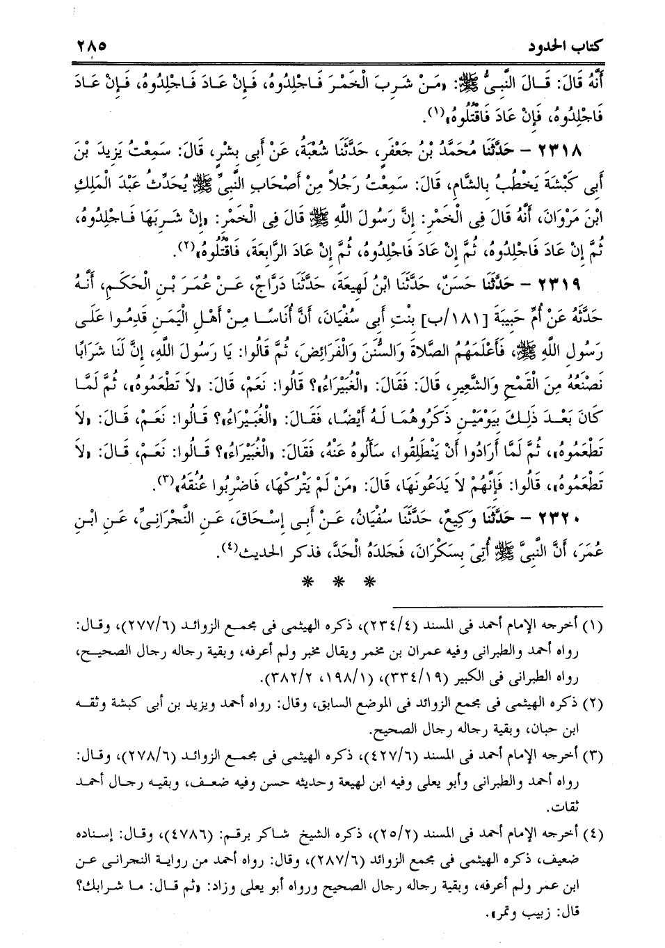 2318 - حَدَّثَنَا مُحَمَّدُ بْنُ جَعْفَرٍ، حَدَّثَنَا شُعْبَةُ، عَنْ أَبِى بِشْرٍ، قَالَ: سَمِعْتُ يَزِيدَ بْنَ أَبِى كَبْشَةَ يَخْطُبُ بِالشَّامِ، قَالَ: سَمِعْتُ رَجُلاً مِنْ أَصْحَابِ النَّبِىِّ صلى الله عليه وسلم يُحَدِّثُ عَبْدَ الْمَلِكِ ابْنَ مَرْوَانَ، أَنَّهُ قَالَ فِى الْخَمْرِ: إِنَّ رَسُولَ اللَّهِ صلى الله عليه وسلم قَالَ فِى الْخَمْرِ: "إِنْ شَرِبَهَا فَاجْلِدُوهُ، ثُمَّ إِنْ عَادَ فَاجْلِدُوهُ، ثُمَّ إِنْ عَادَ فَاجْلِدُوهُ، ثُمَّ إِنْ عَادَ الرَّابِعَةَ، فَاقْتُلُوهُ.