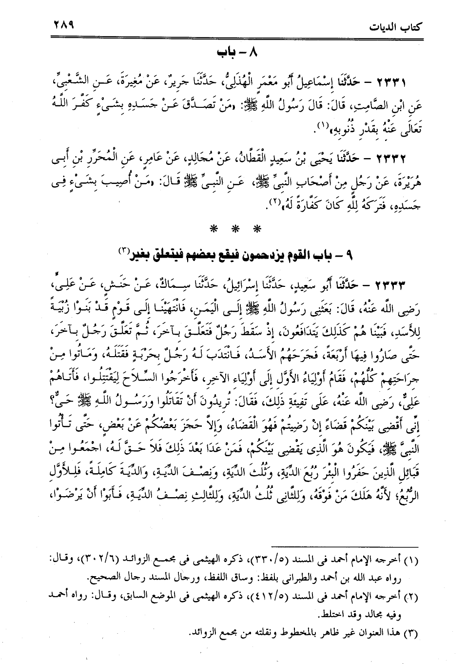2333 - حَدَّثَنَا أَبُو سَعِيدٍ، حَدَّثَنَا إِسْرَائِيلُ، حَدَّثَنَا سِمَاكٌ، عَنْ حَنَشٍ، عَنْ عَلِىٍّ، رَضِى اللَّه عَنْهُ، قَالَ: بَعَثَنِى رَسُولُ اللَّهِ صلى الله عليه وسلم إِلَى الْيَمَنِ، فَانْتَهَيْنَا إِلَى قَوْمٍ قَدْ بَنَوْا زُبْيَةً لِلأَسَدِ، فَبَيْنَا هُمْ كَذَلِكَ يَتَدَافَعُونَ، إِذْ سَقَطَ رَجُلٌ فَتَعَلَّقَ بِآخَرَ، ثُمَّ تَعَلَّقَ رَجُلٌ بِآخَرَ، حَتَّى صَارُوا فِيهَا أَرْبَعَةً، فَجَرَحَهُمُ الأَسَدُ، فَانْتَدَبَ لَهُ رَجُلٌ بِحَرْبَةٍ فَقَتَلَهُ، وَمَاتُوا مِنْ جِرَاحَتِهِمْ كُلُّهُمْ، فَقَامُ أَوْلِيَاءُ الأَوَّلِ إِلَى أَوْلِيَاءِ الآخِرِ، فَأَخْرَجُوا السِّلاَحَ لِيَقْتَتِلُوا، فَأَتَاهُمْ عَلِىٌّ، رَضِى اللَّه عَنْهُ، عَلَى تَفِيئَةِ ذَلِكَ، فَقَالَ: تُرِيدُونَ أَنْ تَقَاتَلُوا وَرَسُولُ اللَّهِ صلى الله عليه وسلم حَىٌّ؟ إِنِّى أَقْضِى بَيْنَكُمْ قَضَاءً إِنْ رَضِيتُمْ فَهُوَ الْقَضَاءُ، وَإِلاَّ حَجَزَ بَعْضُكُمْ عَنْ بَعْضٍ، حَتَّى تَأْتُوا النَّبِىَّ صلى الله عليه وسلم، فَيَكُونَ هُوَ الَّذِى يَقْضِى بَيْنَكُمْ، فَمَنْ عَدَا بَعْدَ ذَلِكَ فَلاَ حَقَّ لَهُ، اجْمَعُوا مِنْ قَبَائِلِ الَّذِينَ حَفَرُوا الْبِئْرَ رُبُعَ الدِّيَةِ، وَثُلُثَ الدِّيَةِ، وَنِصْفَ الدِّيَةِ، وَالدِّيَةَ كَامِلَةً، فَلِلأَوَّلِ الرُّبُعُ؛ لأَنَّهُ هَلَكَ مَنْ فَوْقَهُ، وَلِلثَّانِى ثُلُثُ الدِّيَةِ، وَلِلثَّالِثِ نِصْفُ الدِّيَةِ، فَأَبَوْا أَنْ يَرْضَوْا، -[290]- فَأَتَوُا النَّبِىَّ صلى الله عليه وسلم وَهُوَ عِنْدَ مَقَامِ إِبْرَاهِيمَ، فَقَصُّوا عَلَيْهِ الْقِصَّةَ، فَقَالَ: "أَنَا لا أَقْضِى بَيْنَكُمْ وَأحْتَبَى، فَقَالَ رَجُلٌ مِنَ الْقَوْمِ: إِنَّ عَلِيًّا قَضَى فِينَا، فَقَصُّوا عَلَيْهِ الْقِصَّةَ، فَأَجَازَهُ رَسُولُ اللَّهِ صلى الله عليه وسلم.
