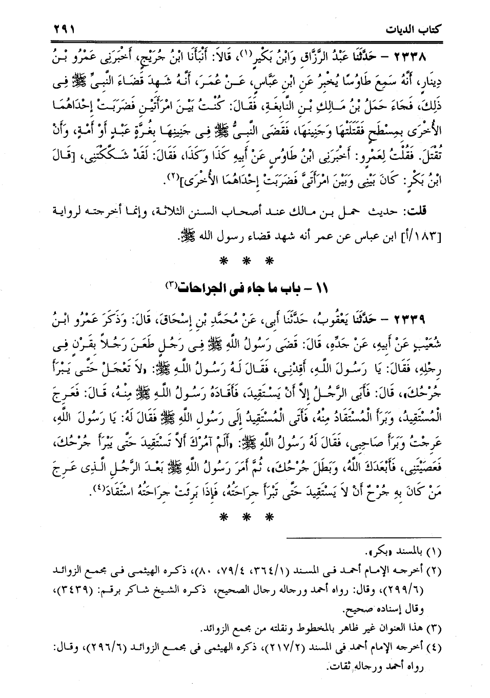 2339 - حَدَّثَنَا يَعْقُوبُ، حَدَّثَنَا أَبِى، عَنْ مُحَمَّدِ بْنِ إِسْحَاقَ، قَالَ: وَذَكَرَ عَمْرُو ابْنُ شُعَيْبٍ عَنْ أَبِيهِ، عَنْ جَدِّهِ، قَالَ: قَضَى رَسُولُ اللَّهِ صلى الله عليه وسلم فِى رَجُلٍ طَعَنَ رَجُلاً بِقَرْنٍ فِى رِجْلِهِ، فَقَالَ: يَا رَسُولَ اللَّهِ، أَقِدْنِى، فَقَالَ لَهُ رَسُولُ اللَّهِ صلى الله عليه وسلم: "لاَ تَعْجَلْ حَتَّى يَبْرَأَ جُرْحُكَ، قَالَ: فَأَبَى الرَّجُلُ إِلاَّ أَنْ يَسْتَقِيدَ، فَأَقَادَهُ رَسُولُ اللَّهِ صلى الله عليه وسلم مِنْهُ، قَالَ: فَعَرِجَ الْمُسْتَقِيدُ، وَبَرَأَ الْمُسْتَقَادُ مِنْهُ، فَأَتَى الْمُسْتَقِيدُ إِلَى رَسُولِ اللَّهِ صلى الله عليه وسلم فَقَالَ لَهُ: يَا رَسُولَ اللَّهِ، عَرِجْتُ وَبَرَأَ صَاحِبِى، فَقَالَ لَهُ رَسُولُ اللَّهِ صلى الله عليه وسلم: "أَلَمْ آمُرْكَ أَلاَّ تَسْتَقِيدَ حَتَّى يَبْرَأَ جُرْحُكَ، فَعَصَيْتَنِى، فَأَبْعَدَكَ اللَّهُ، وَبَطَلَ جُرْحُكَ، ثُمَّ أَمَرَ رَسُولُ اللَّهِ صلى الله عليه وسلم بَعْدَ الرَّجُلِ الَّذِى عَرِجَ مَنْ كَانَ بِهِ جُرْحٌ أَنْ لاَ يَسْتَقِيدَ حَتَّى تَبْرَأَ جِرَاحَتُهُ، فَإِذَا بَرِئَتْ جِرَاحَتُهُ اسْتَقَادَ.
