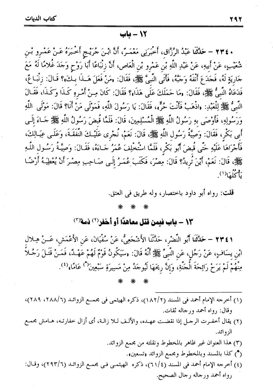 2340 - حَدَّثَنَا عَبْدُ الرَّزَّاقِ، أَخْبَرَنِى مَعْمَرٌ، أَنَّ ابْنَ جُرَيْجٍ أَخْبَرَهُ عَنْ عَمْرِو بْنِ شُعَيْبٍ، عَنْ أَبِيهِ، عَنْ عَبْدِ اللَّهِ بْنِ عَمْرِو بْنِ الْعَاص، أَنَّ زِنْبَاعًا أَبَا رَوْحٍ وَجَدَ غُلامًا لَهُ مَعَ جَارِيَةٍ لَهُ، فَجَدَعَ أَنْفَهُ وَجَبَّهُ، فَأَتَى النَّبِىَّ صلى الله عليه وسلم، فَقَالَ: "مَنْ فَعَلَ هَذَا بِكَ؟ قَالَ: زِنْبَاعٌ، فَدَعَاهُ النَّبِىُّ صلى الله عليه وسلم، فَقَالَ: "مَا حَمَلَكَ عَلَى هَذَا؟ فَقَالَ: كَانَ مِنْ أَمْرِهِ كَذَا وَكَذَا، فَقَالَ النَّبِىُّ صلى الله عليه وسلم لِلْعَبْدِ: "اذْهَبْ فَأَنْتَ حُرٌّ، فَقَالَ: يَا رَسُولَ اللَّهِ، فَمَوْلَى مَنْ أَنَا؟ قَالَ: مَوْلَى اللَّهِ وَرَسُولِهِ، فَأَوْصَى بِهِ رَسُولُ اللَّهِ صلى الله عليه وسلم الْمُسْلِمِينَ، قَالَ: فَلَمَّا قُبِضَ رَسُولُ اللَّهِ صلى الله عليه وسلم جَاءَ إِلَى أَبِى بَكْرٍ، فَقَالَ: وَصِيَّةُ رَسُولِ اللَّهِ صلى الله عليه وسلم، قَالَ: نَعَمْ، نُجْرِى عَلَيْكَ النَّفَقَةَ، وَعَلَى عِيَالِكَ، فَأَجْرَاهَا عَلَيْهِ حَتَّى قُبِضَ أَبُو بَكْرٍ، فَلَمَّا اسْتُخْلِفَ عُمَرُ جَاءَهُ، فَقَالَ: وَصِيَّةُ رَسُولِ اللَّهِ صلى الله عليه وسلم، قَالَ: نَعَمْ، أَيْنَ تُرِيدُ؟ قَالَ: مِصْرَ، فَكَتَبَ عُمَرُ إِلَى صَاحِبِ مِصْرَ أَنْ يُعْطِيَهُ أَرْضًا يَأْكُلُهَا.