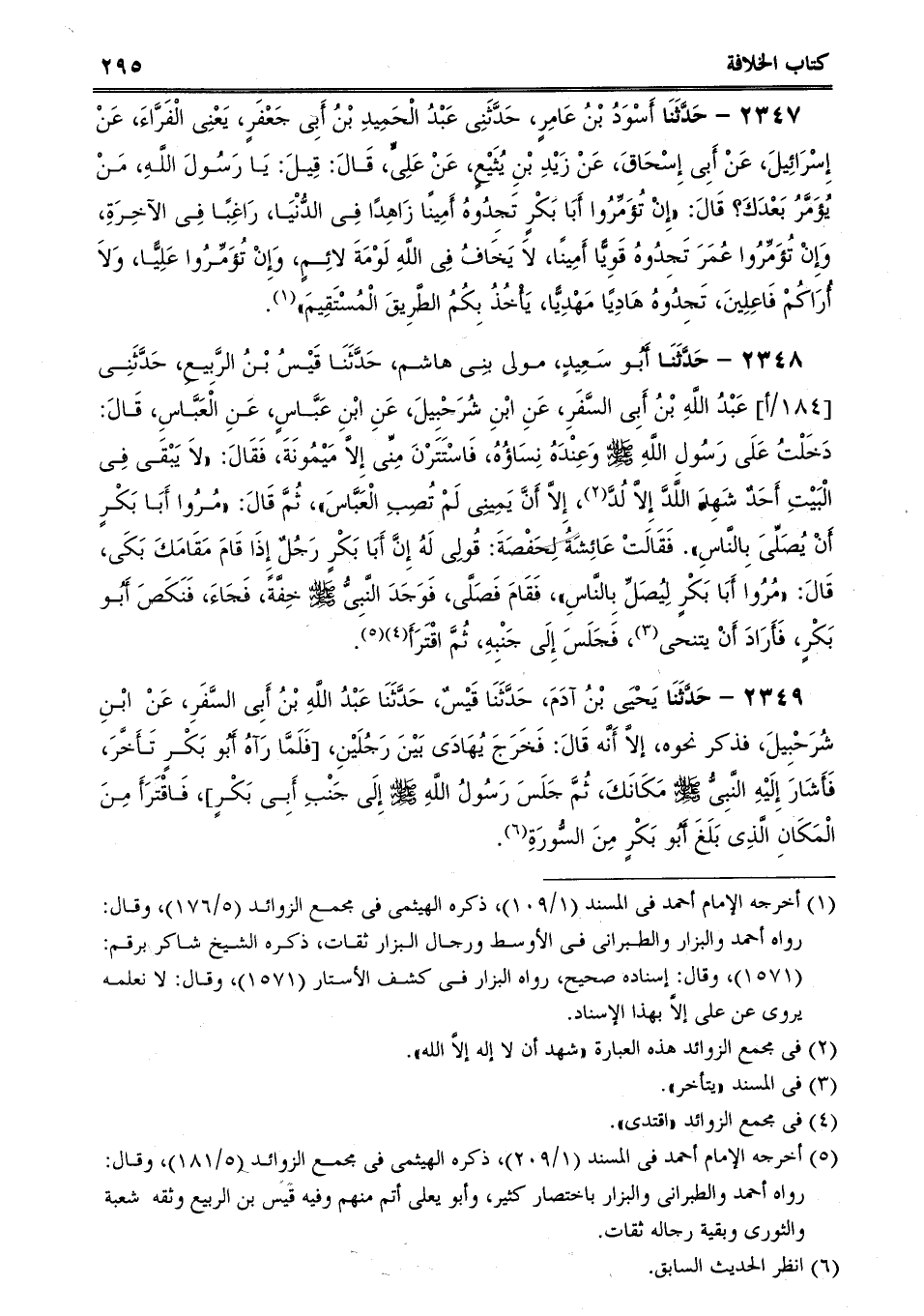 2347 - حَدَّثَنَا أَسْوَدُ بْنُ عَامِرٍ، حَدَّثَنِى عَبْدُ الْحَمِيدِ بْنُ أَبِى جَعْفَرٍ، يَعْنِى الْفَرَّاءَ، عَنْ إِسْرَائِيلَ، عَنْ أَبِى إِسْحَاقَ، عَنْ زَيْدِ بْنِ يُثَيْعٍ، عَنْ عَلِىٍّ، قَالَ: قِيلَ: يَا رَسُولَ اللَّهِ، مَنْ يُؤَمَّرُ بَعْدَكَ؟ قَالَ: "إِنْ تُؤَمِّرُوا أَبَا بَكْرٍ تَجِدُوهُ أَمِينًا زَاهِدًا فِى الدُّنْيَا، رَاغِبًا فِى الآخِرَةِ، وَإِنْ تُؤَمِّرُوا عُمَرَ تَجِدُوهُ قَوِيًّا أَمِينًا، لاَ يَخَافُ فِى اللَّهِ لَوْمَةَ لائِمٍ، وَإِنْ تُؤَمِّرُوا عَلِيًّا، وَلاَ أُرَاكُمْ فَاعِلِينَ، تَجِدُوهُ هَادِيًا مَهْدِيًّا، يَأْخُذُ بِكُمُ الطَّرِيقَ الْمُسْتَقِيمَ.