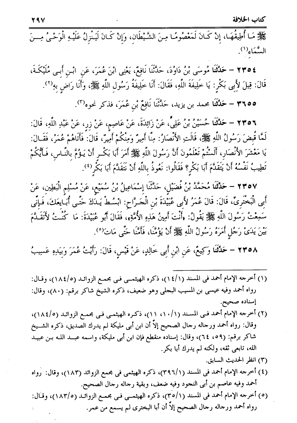2356 - حَدَّثَنَا حُسَيْنُ بْنُ عَلِىٍّ، عَنْ زَائِدَةَ، عَنْ عَاصِمٍ، عَنْ زِرٍ، عَنْ عَبْدِ اللَّهِ، قَالَ: لَمَّا قُبِضَ رَسُولُ اللَّهِ صلى الله عليه وسلم، قَالَتِ الأَنْصَارُ: مِنَّا أَمِيرٌ وَمِنْكُمْ أَمِيرٌ، قَالَ: فَأَتَاهُمْ عُمَرُ، فَقَالَ: يَا مَعْشَرَ الأَنْصَارِ، أَلَسْتُمْ تَعْلَمُونَ أَنَّ رَسُولَ اللَّهِ صلى الله عليه وسلم أَمَرَ أَبَا بَكْرٍ أَنْ يَؤُمَّ بِالنَّاسِ، فَأَيُّكُمْ تَطِيبُ نَفْسُهُ أَنْ يَتَقَدَّمَ أَبَا بَكْرٍ؟ فَقَالُوا: نَعُوذُ بِاللَّهِ أَنْ نَتَقَدَّمَ أَبَا بَكْرٍ.