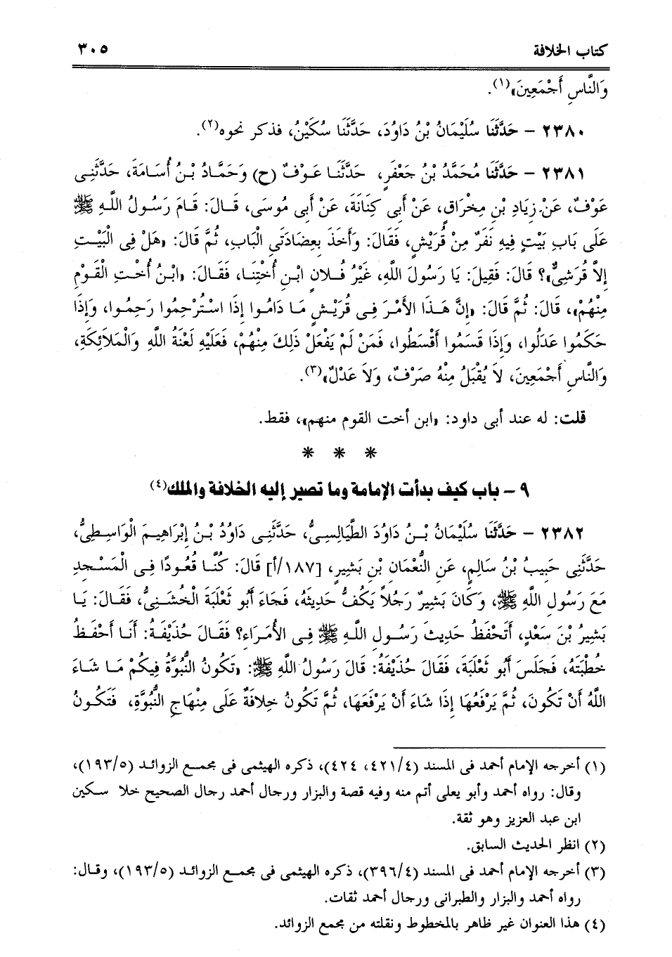 2382 - حَدَّثَنَا سُلَيْمَانُ بْنُ دَاوُدَ الطَّيَالِسِىُّ، حَدَّثَنِى دَاوُدُ بْنُ إِبْرَاهِيمَ الْوَاسِطِىُّ، حَدَّثَنِى حَبِيبُ بْنُ سَالِمٍ، عَنِ النُّعْمَانِ بْنِ بَشِيرٍ، قَالَ: كُنَّا قُعُودًا فِى الْمَسْجِدِ مَعَ رَسُولِ اللَّهِ صلى الله عليه وسلم، وَكَانَ بَشِيرٌ رَجُلاً يَكُفُّ حَدِيثَهُ، فَجَاءَ أَبُو ثَعْلَبَةَ الْخُشَنِىُّ، فَقَالَ: يَا بَشِيرُ بْنَ سَعْدٍ، أَتَحْفَظُ حَدِيثَ رَسُولِ اللَّهِ صلى الله عليه وسلم فِى الأُمَرَاءِ؟ فَقَالَ حُذَيْفَةُ: أَنَا أَحْفَظُ خُطْبَتَهُ، فَجَلَسَ أَبُو ثَعْلَبَةَ، فَقَالَ حُذَيْفَةُ: قَالَ رَسُولُ اللَّهِ صلى الله عليه وسلم: "تَكُونُ النُّبُوَّةُ فِيكُمْ مَا شَاءَ اللَّهُ أَنْ تَكُونَ، ثُمَّ يَرْفَعُهَا إِذَا شَاءَ أَنْ يَرْفَعَهَا، ثُمَّ تَكُونُ خِلافَةٌ عَلَى مِنْهَاجِ النُّبُوَّةِ، فَتَكُونُ -[306]- مَا شَاءَ اللَّهُ أَنْ تَكُونَ، ثُمَّ يَرْفَعُهَا إِذَا شَاءَ اللَّهُ أَنْ يَرْفَعَهَا، ثُمَّ تَكُونُ مُلْكًا عَاضًّا، فَيَكُونُ مَا شَاءَ اللَّهُ أَنْ يَكُونَ، ثُمَّ يَرْفَعُهَا إِذَا شَاءَ أَنْ يَرْفَعَهَا، [ثُمَّ تَكُونُ مُلْكًا جَبْرِيَّةً فَتَكُونُ مَا شَاءَ اللَّهُ أَنْ تَكُونَ، ثُمَّ يَرْفَعُهَا إِذَا شَاءَ أَنْ يَرْفَعَهَا، ثُمَّ تَكُونُ خِلاَفَةً عَلَى مِنْهَاجِ النُّبُوَّةِ] ، ثُمَّ سَكَتَ، قَالَ حَبِيبٌ: فَلَمَّا قَامَ عُمَرُ بْنُ عَبْدِ الْعَزِيزِ، وَكَانَ يَزِيدُ بْنُ النُّعْمَانِ بْنِ بَشِيرٍ فِى صَحَابَتِهِ، فَكَتَبْتُ إِلَيْهِ بِهَذَا الْحَدِيثِ أُذَكِّرُهُ إِيَّاهُ، فَقُلْتُ لَهُ: إِنِّى أَرْجُو أَنْ يَكُونَ أَمِيرُ الْمُؤْمِنِينَ، يَعْنِى عُمَرَ بَعْدَ الْمُلْكِ الْعَاضِّ وَالْجَبْرِيَّةِ، فَأُدْخِلَ كِتَابِى عَلَى عُمَرَ بْنِ عَبْدِ الْعَزِيزِ، فَسُرَّ بِهِ وَأَعْجَبَهُ.