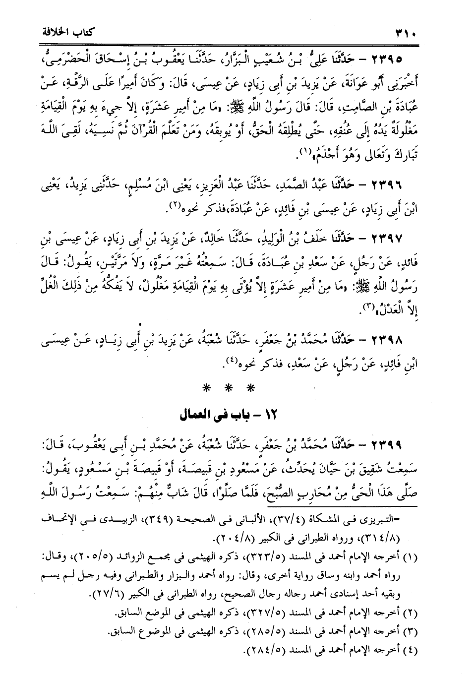 2395 - حَدَّثَنَا عَلِىُّ بْنُ شُعَيْبٍ الْبَزَّارُ، حَدَّثَنَا يَعْقُوبُ بْنُ إِسْحَاقَ الْحَضْرَمِىُّ، أَخْبَرَنِى أَبُو عَوَانَةَ، عَنْ يَزِيدَ بْنِ أَبِى زِيَادٍ، عَنْ عِيسَى، قَالَ: وَكَانَ أَمِيرًا عَلَى الرَّقَّةِ، عَنْ عُبَادَةَ بْنِ الصَّامِتِ، قَالَ: قَالَ رَسُولُ اللَّهِ صلى الله عليه وسلم: "مَا مِنْ أَمِيرِ عَشَرَةٍ، إِلاَّ جِيءَ بِهِ يَوْمَ الْقِيَامَةِ مَغْلُولَةٌ يَدُهُ إِلَى عُنُقِهِ، حَتَّى يُطْلِقَهُ الْحَقُّ، أَوْ يُوبِقَهُ، وَمَنْ تَعَلَّمَ الْقُرْآنَ ثُمَّ نَسِيَهُ، لَقِىَ اللَّهَ تَبَاركَ وَتَعَالى وَهُوَ أَجْذَمُ.