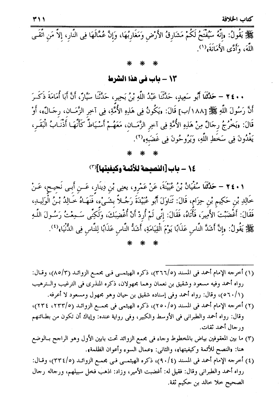 2401 - حَدَّثَنَا سُفْيَانُ بْنُ عُيَيْنَةَ، عَنْ عَمْرِو، يعنِى بْنِ دِينَارٍ، عَنِ أَبِى نَجِيحٍ، عَنْ خَالِدِ بْنِ حَكِيمِ بْنِ حِزَامٍ، قَالَ: تَنَاوَلَ أَبُو عُبَيْدَةَ رَجُلاً بِشَىْءٍ، فَنَهَاهُ خَالِدُ بْنُ الْوَلِيدِ، فَقَالَ: أَغْضَبْتَ الأَمِيرَ، فَأَتَاهُ، فَقَالَ: إِنِّى لَمْ أُرِدْ أَنْ أُغْضِبَكَ، وَلَكِنِّى سَمِعْتُ رَسُولَ اللَّهِ صلى الله عليه وسلم يَقُولُ: "إِنَّ أَشَدَّ النَّاسِ عَذَابًا يَوْمَ الْقِيَامَةِ، أَشَدُّ النَّاسِ عَذَابًا لِلنَّاسِ فِى الدُّنْيَا.