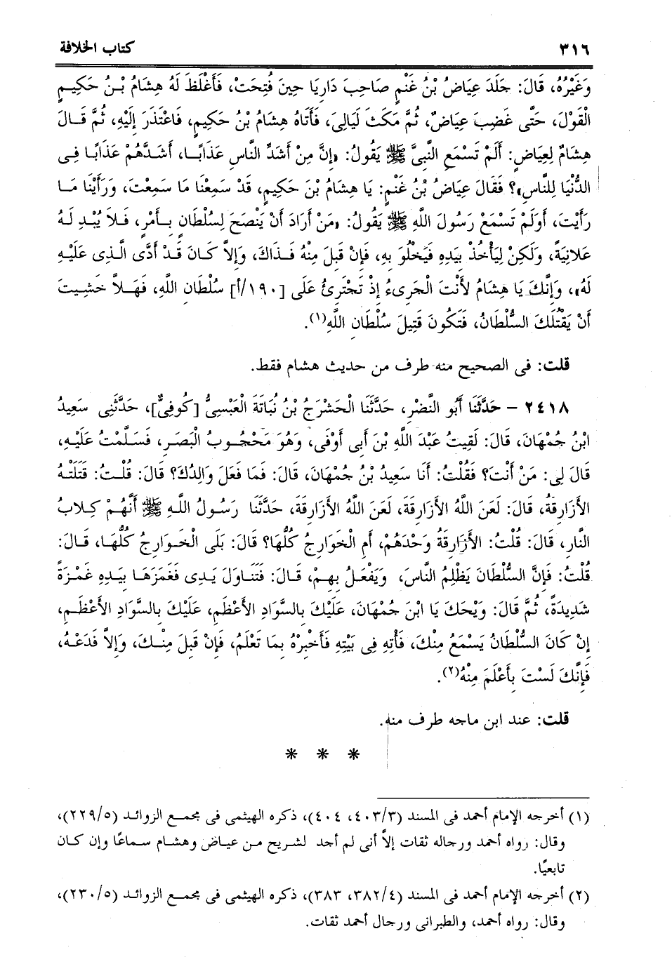 2418 - حَدَّثَنَا أَبُو النَّضْرِ، حَدَّثَنَا الْحَشْرَجُ بْنُ نُبَاتَةَ الْعَبْسِىُّ [كُوفِىٌّ] ، حَدَّثَنِى سَعِيدُ ابْنُ جُمْهَانَ، قَالَ: لَقِيتُ عَبْدَ اللَّهِ بْنَ أَبِى أَوْفَى، وَهُوَ مَحْجُوبُ الْبَصَرِ، فَسَلَّمْتُ عَلَيْهِ، قَالَ لِى: مَنْ أَنْتَ؟ فَقُلْتُ: أَنَا سَعِيدُ بْنُ جُمْهَانَ، قَالَ: فَمَا فَعَلَ وَالِدُكَ؟ قَالَ: قُلْتُ: قَتَلَتْهُ الأَزَارِقَةُ، قَالَ: لَعَنَ اللَّهُ الأَزَارِقَةَ، لَعَنَ اللَّهُ الأَزَارِقَةَ، حَدَّثَنَا رَسُولُ اللَّهِ صلى الله عليه وسلم أَنَّهُمْ كِلابُ النَّارِ، قَالَ: قُلْتُ: الأَزَارِقَةُ وَحْدَهُمْ، أَمِ الْخَوَارِجُ كُلُّهَا؟ قَالَ: بَلَى الْخَوَارِجُ كُلُّهَا، قَالَ: قُلْتُ: فَإِنَّ السُّلْطَانَ يَظْلِمُ النَّاسَ، وَيَفْعَلُ بِهِمْ، قَالَ: فَتَنَاوَلَ يَدِى فَغَمَزَهَا بِيَدِهِ غَمْزَةً شَدِيدَةً، ثُمَّ قَالَ: وَيْحَكَ يَا ابْنَ جُمْهَانَ، عَلَيْكَ بِالسَّوَادِ الأَعْظَمِ، عَلَيْكَ بِالسَّوَادِ الأَعْظَمِ، إِنْ كَانَ السُّلْطَانُ يَسْمَعُ مِنْكَ، فَأْتِهِ فِى بَيْتِهِ فَأَخْبِرْهُ بِمَا تَعْلَمُ، فَإِنْ قَبِلَ مِنْكَ، وَإِلاَّ فَدَعْهُ، فَإِنَّكَ لَسْتَ بِأَعْلَمَ مِنْهُ.