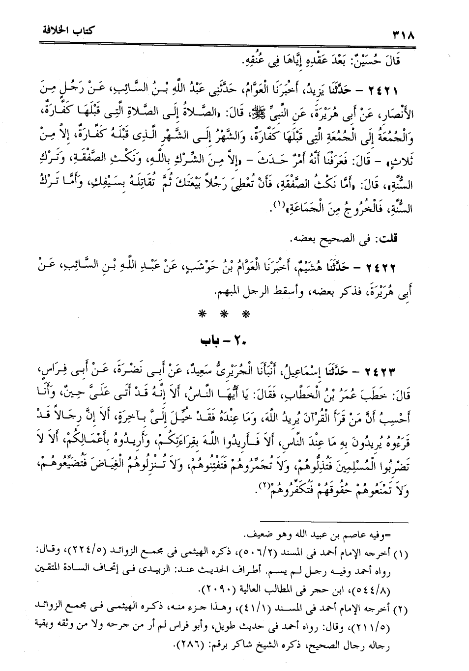 2421 - حَدَّثَنَا يَزِيدُ، أَخْبَرَنَا الْعَوَّامُ، حَدَّثَنِى عَبْدُ اللَّهِ بْنُ السَّائِبِ، عَنْ رَجُلٍ مِنَ الأَنْصَارِ، عَنْ أَبِى هُرَيْرَةَ، عَنِ النَّبِىِّ صلى الله عليه وسلم، قَالَ: "الصَّلاةُ إِلَى الصَّلاةِ الَّتِى قَبْلَهَا كَفَّارَةٌ، وَالْجُمُعَةُ إِلَى الْجُمُعَةِ الَّتِى قَبْلَهَا كَفَّارَةٌ، وَالشَّهْرُ إِلَى الشَّهْرِ الَّذِى قَبْلَهُ كَفَّارَةٌ، إِلاَّ مِنْ ثَلاثٍ - قَالَ: فَعَرَفْنَا أَنَّهُ أَمْرٌ حَدَثَ - "إِلاَّ مِنَ الشِّرْكِ بِاللَّهِ، وَنَكْثِ الصَّفْقَةِ، وَتَرْكِ السُّنَّةِ، قَالَ: "أَمَّا نَكْثُ الصَّفْقَةِ، فَأَنْ تُعْطِىَ رَجُلاً بَيْعَتَكَ ثُمَّ تُقَاتِلَهُ بِسَيْفِكِ، وَأَمَّا تَرْكُ السُّنَّةِ، فَالْخُرُوجُ مِنَ الْجَمَاعَةِ.