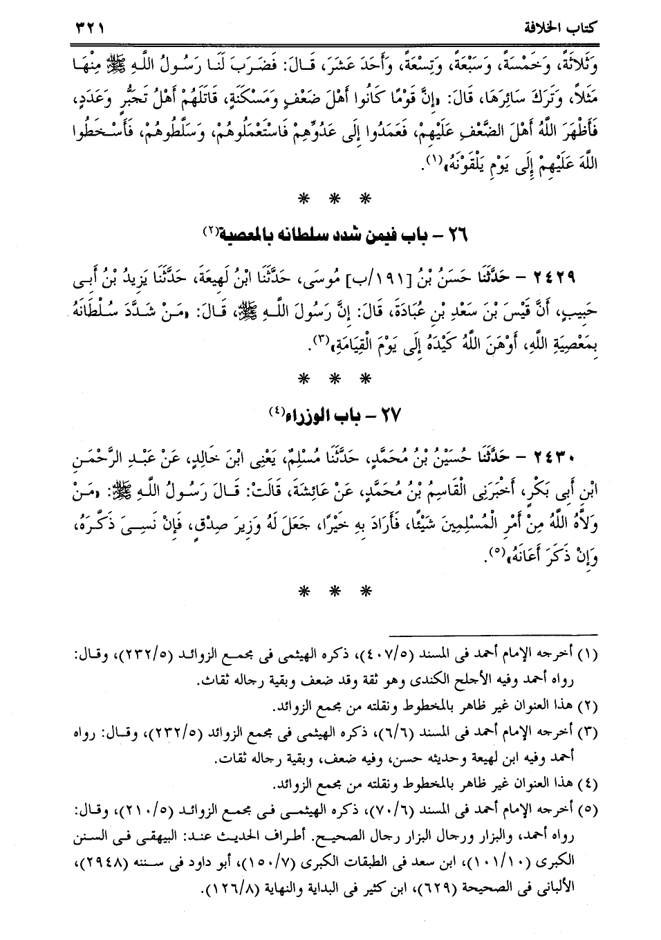 2429 - حَدَّثَنَا حَسَنُ بْنُ مُوسَى، حَدَّثَنَا ابْنُ لَهِيعَةَ، حَدَّثَنَا يَزِيدُ بْنُ أَبِى حَبِيبٍ، أَنَّ قَيْسَ بْنَ سَعْدِ بْنِ عُبَادَةَ، قَالَ: إِنَّ رَسُولَ اللَّهِ صلى الله عليه وسلم، قَالَ: "مَنْ شَدَّدَ سُلْطَانَهُ بِمَعْصِيَةِ اللَّهِ، أَوْهَنَ اللَّهُ كَيْدَهُ إِلَى يَوْمَ الْقِيَامَةِ.