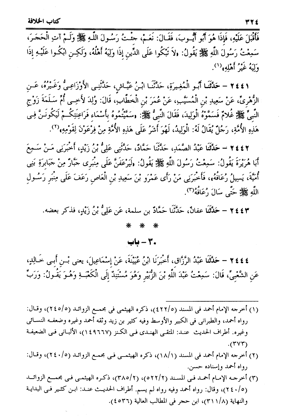2441 - حَدَّثَنَا أَبُو الْمُغِيرَةِ، حَدَّثَنَا ابْنُ عَيَّاشٍ، حَدَّثَنِى الأَوْزَاعِىُّ وَغَيْرُهُ، عَنِ الزُّهْرِىِّ، عَنْ سَعِيدِ بْنِ الْمُسَيَّبِ، عَنْ عُمَرَ بْنِ الْخَطَّابِ، قَالَ: وُلِدَ لأَخِى أُمِّ سَلَمَةَ زَوْجِ النَّبِىِّ صلى الله عليه وسلم غُلامٌ فَسَمَّوْهُ الْوَلِيدَ، فَقَالَ النَّبِىُّ صلى الله عليه وسلم: "سَمَّيْتُمُوهُ بِأَسْمَاءِ فَرَاعِنَتِكُمْ لَيَكُونَنَّ فِى هَذِهِ الأُمَّةِ، رَجُلٌ يُقَالُ لَهُ: الْوَلِيدُ، لَهُوَ أَشَرُ عَلَى هَذِهِ الأُمَّةِ مِنْ فِرْعَوْنَ لِقَوْمِهِ.