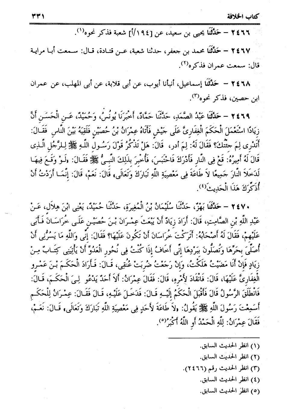 2470 - حَدَّثَنَا بَهْزٌ، حَدَّثَنَا سُلَيْمَانُ بْنُ الْمُغِيرَةِ، حَدَّثَنَا حُمَيْدٌ، يَعْنِى ابْنَ هِلاَلٍ، عَنْ عَبْدِ اللَّهِ بْنِ الصَّامِتِ، قَالَ: أَرَادَ زِيَادٌ أَنْ يَبْعَثَ عِمْرَانَ بْنَ حُصَيْنٍ عَلَى خُرَاسَانَ فَأَبَى عَلَيْهِمْ، فَقَالَ لَهُ أَصْحَابُهُ: أَتَرَكْتَ خُرَاسَانَ أَنْ تَكُونَ عَلَيْهَا؟ فَقَالَ: إِنِّى وَاللَّهِ مَا يَسُرُّنِى أَنْ أُصَلِّىَ بِحَرِّهَا وَتُصَلُّونَ بِبَرْدِهَا إِنِّى أَخَافُ إِذَا كُنْتُ فِى نُحُورِ الْعَدُوِّ أَنْ يَأْتِيَنِى كِتَابٌ مِنْ زِيَادٍ فَإِنْ أَنَا مَضَيْتُ هَلَكْتُ، وَإِنْ رَجَعْتُ ضُرِبَتْ عُنُقِى، قَالَ: فَأَرَادَ الْحَكَمَ بْنَ عَمْرٍو الْغِفَارِىَّ عَلَيْهَا، قَالَ: فَانْقَادَ لأَمْرِهِ، قَالَ: فَقَالَ عِمْرَانُ: أَلاَ أَحَدٌ يَدْعُو لِىَ الْحَكَمَ، قَالَ: فَانْطَلَقَ الرَّسُولُ قَالَ فَأَقْبَلَ الْحَكَمُ إِلَيْهِ قَالَ: فَدَخَلَ عَلَيْهِ، قَالَ فَقَالَ: عِمْرَانُ لِلْحَكَمِ أَسَمِعْتَ رَسُولَ اللَّهِ صلى الله عليه وسلم يَقُولُ: "لاَ طَاعَةَ لأَحَدٍ فِى مَعْصِيَةِ اللَّهِ تَبَارَكَ وَتَعَالَى قَالَ: نَعَمْ، فَقَالَ عِمْرَانُ: لِلَّهِ الْحَمْدُ أَوِ اللَّهُ أَكْبَرُ.