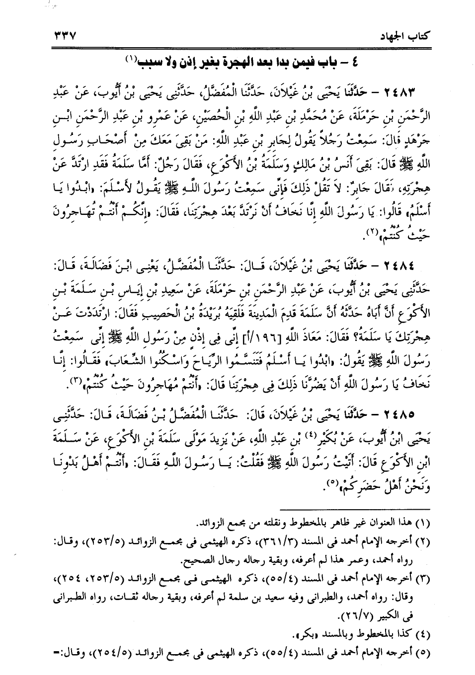2484 - حَدَّثَنَا يَحْيَى بْنُ غَيْلاَنَ، قَالَ: حَدَّثَنَا الْمُفَضَّلُ، يَعْنِى ابْنَ فَضَالَةَ، قَالَ: حَدَّثَنِى يَحْيَى بْنُ أَيُّوبَ، عَنْ عَبْدِ الرَّحْمَنِ بْنِ حَرْمَلَةَ، عَنْ سَعِيدِ بْنِ إِيَاسِ بْنِ سَلَمَةَ بْنِ الأَكْوَعِ أَنَّ أَبَاهُ حَدَّثَهُ أَنَّ سَلَمَةَ قَدِمَ الْمَدِينَةَ فَلَقِيَهُ بُرَيْدَةُ بْنُ الْحَصِيبِ فَقَالَ: ارْتَدَدْتَ عَنْ هِجْرَتِكَ يَا سَلَمَةُ؟ فَقَالَ: مَعَاذَ اللَّهِ إِنِّى فِى إِذْنٍ مِنْ رَسُولِ اللَّهِ صلى الله عليه وسلم إِنِّى سَمِعْتُ رَسُولَ اللَّهِ صلى الله عليه وسلم يَقُولُ: "ابْدُوا يَا أَسْلَمُ فَتَنَسَّمُوا الرِّيَاحَ وَاسْكُنُوا الشِّعَابَ فَقَالُوا: إِنَّا نَخَافُ يَا رَسُولَ اللَّهِ أَنْ يَضُرَّنَا ذَلِكَ فِى هِجْرَتِنَا قَالَ: "أَنْتُمْ مُهَاجِرُونَ حَيْثُ كُنْتُمْ.