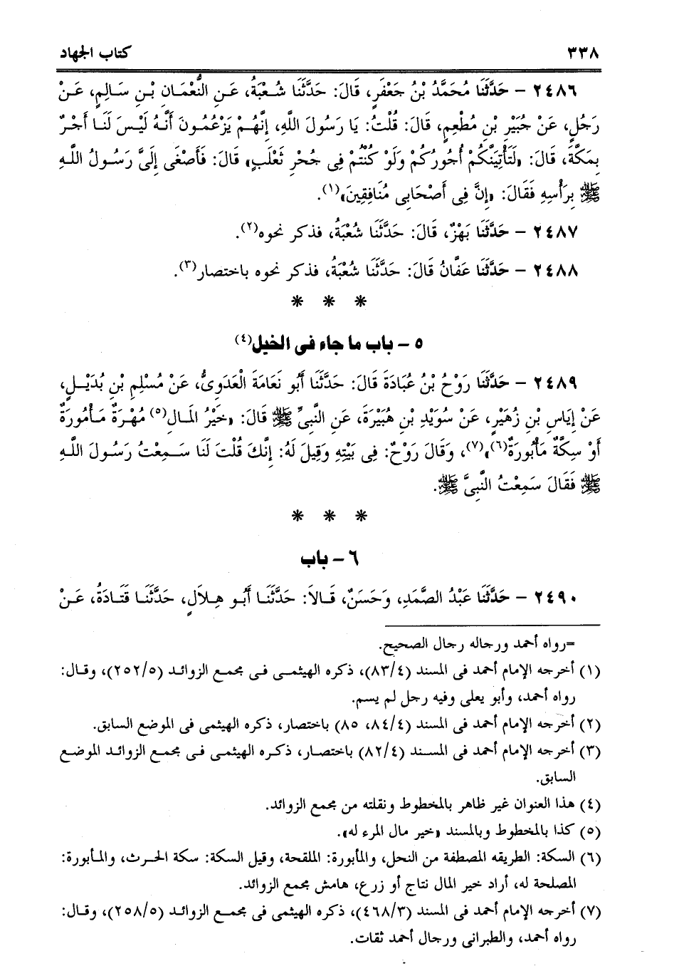 2486 - حَدَّثَنَا مُحَمَّدُ بْنُ جَعْفَرٍ، قَالَ: حَدَّثَنَا شُعْبَةُ، عَنِ النُّعْمَانِ بْنِ سَالِمٍ، عَنْ رَجُلٍ، عَنْ جُبَيْرِ بْنِ مُطْعِمٍ، قَالَ: قُلْتُ: يَا رَسُولَ اللَّهِ، إِنَّهُمْ يَزْعُمُونَ أَنَّهُ لَيْسَ لَنَا أَجْرٌ بِمَكَّةَ، قَالَ: "لَتَأْتِيَنَّكُمْ أُجُورُكُمْ وَلَوْ كُنْتُمْ فِى جُحْرِ ثَعْلَبٍ قَالَ: فَأَصْغَى إِلَىَّ رَسُولُ اللَّهِ صلى الله عليه وسلم بِرَأْسِهِ فَقَالَ: "إِنَّ فِى أَصْحَابِى مُنَافِقِينَ.