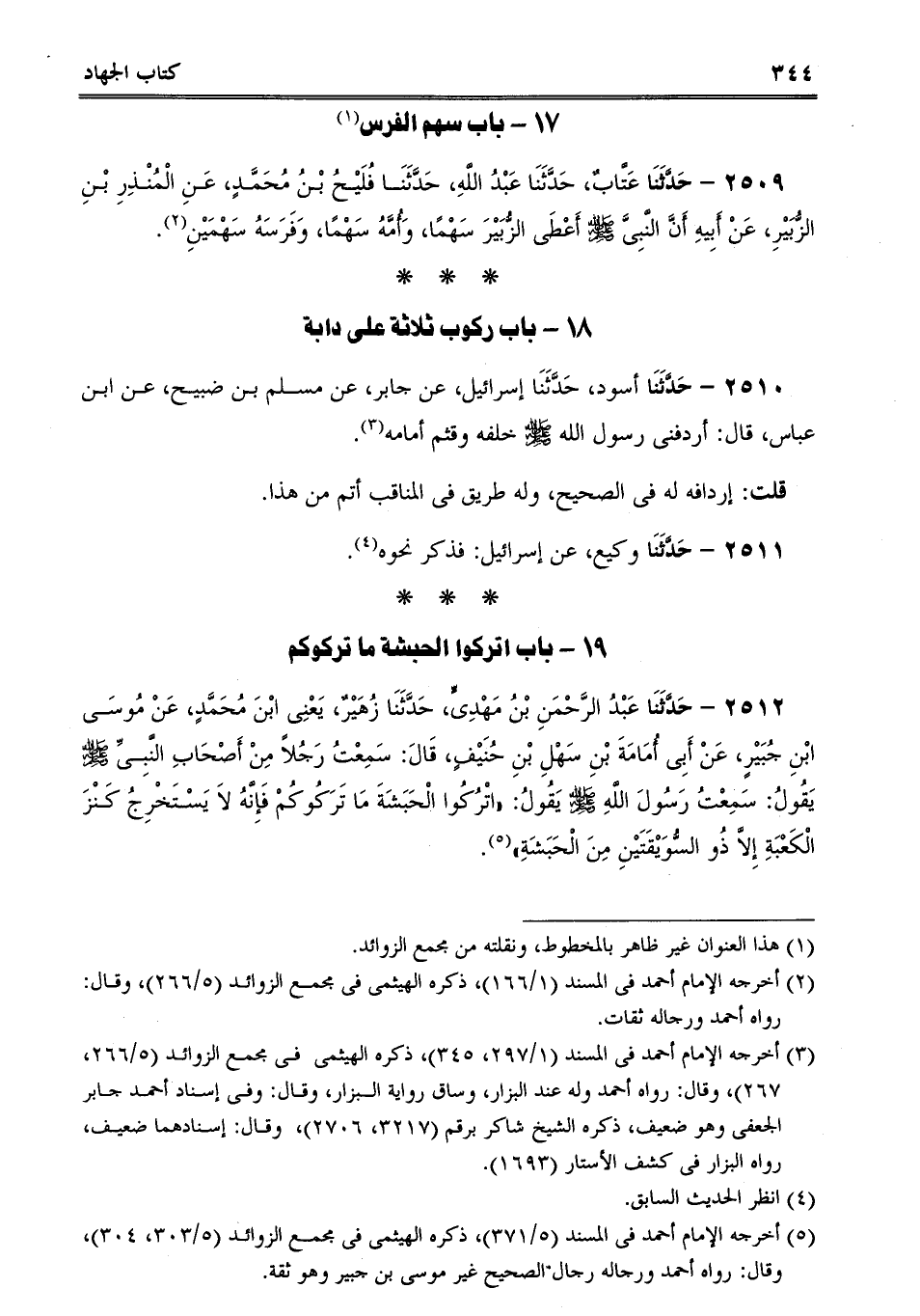 2512 - حَدَّثَنَا عَبْدُ الرَّحْمَنِ بْنُ مَهْدِىٍّ، حَدَّثَنَا زُهَيْرٌ، يَعْنِى ابْنَ مُحَمَّدٍ، عَنْ مُوسَى ابْنِ جُبَيْرٍ، عَنْ أَبِى أُمَامَةَ بْنِ سَهْلِ بْنِ حُنَيْفٍ، قَالَ: سَمِعْتُ رَجُلاً مِنْ أَصْحَابِ النَّبِىِّ صلى الله عليه وسلم يَقُولُ: سَمِعْتُ رَسُولَ اللَّهِ صلى الله عليه وسلم يَقُولُ: "اتْرُكُوا الْحَبَشَةَ مَا تَرَكُوكُمْ فَإِنَّهُ لاَ يَسْتَخْرِجُ كَنْزَ الْكَعْبَةِ إِلاَّ ذُو السُّوَيْقَتَيْنِ مِنَ الْحَبَشَةِ. -[345]-