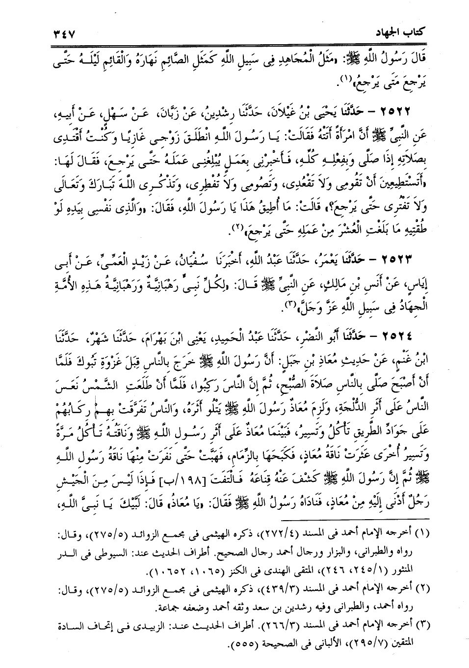 2522 - حَدَّثَنَا يَحْيَى بْنُ غَيْلاَنَ، حَدَّثَنَا رِشْدِينُ، عَنْ زَبَّانَ، عَنْ سَهْلٍ، عَنْ أَبِيهِ، عَنِ النَّبِىِّ صلى الله عليه وسلم أَنَّ امْرَأَةً أَتَتْهُ فَقَالَتْ: يَا رَسُولَ اللَّهِ انْطَلَقَ زَوْجِى غَازِيًا وَكُنْتُ أَقْتَدِى بِصَلاَتِهِ إِذَا صَلَّى وَبِفِعْلِهِ كُلِّهِ، فَأَخْبِرْنِى بِعَمَلٍ يُبْلِغُنِى عَمَلَهُ حَتَّى يَرْجِعَ، فَقَالَ لَهَا: "أَتَسْتَطِيعِينَ أَنْ تَقُومِى وَلاَ تَقْعُدِى، وَتَصُومِى وَلاَ تُفْطِرِى، وَتَذْكُرِى اللَّهَ تَبَارَكَ وَتَعَالَى وَلاَ تَفْتُرِى حَتَّى يَرْجِعَ؟ قَالَتْ: مَا أُطِيقُ هَذَا يَا رَسُولَ اللَّهِ، فَقَالَ: "وَالَّذِى نَفْسِى بِيَدِهِ لَوْ طُقْتِيهِ مَا بَلَغْتِ الْعُشْرَ مِنْ عَمَلِهِ حَتَّى يَرْجِعَ.
