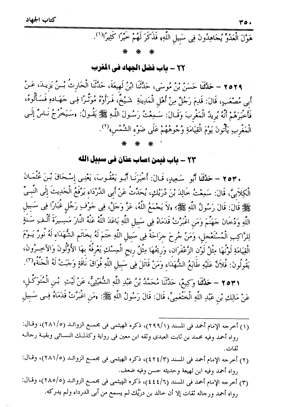 2529 - حَدَّثَنَا حَسَنُ بْنُ مُوسَى، حَدَّثَنَا ابْنُ لَهِيعَةَ، حَدَّثَنَا الْحَارِثُ بْنُ يَزِيدَ، عَنْ أَبِى مُصْعَبٍ، قَالَ: قَدِمَ رَجُلٌ مِنْ أَهْلِ الْمَدِينَةِ شَيْخٌ، فَرَأَوْهُ مُوَثِّرًا فِى جَهَادهِ فَسَأَلُوهُ، فَأَخْبَرَهُمْ أَنَّهُ يُرِيدُ الْمَغْرِبَ وَقَالَ: سَمِعْتُ رَسُولَ اللَّهِ صلى الله عليه وسلم يَقُولُ: "سَيَخْرُجُ نَاسٌ إِلَى الْمَغْرِبِ يَأْتُونَ يَوْمَ الْقِيَامَةِ وُجُوهُهُمْ عَلَى ضَوْءِ الشَّمْسِ.