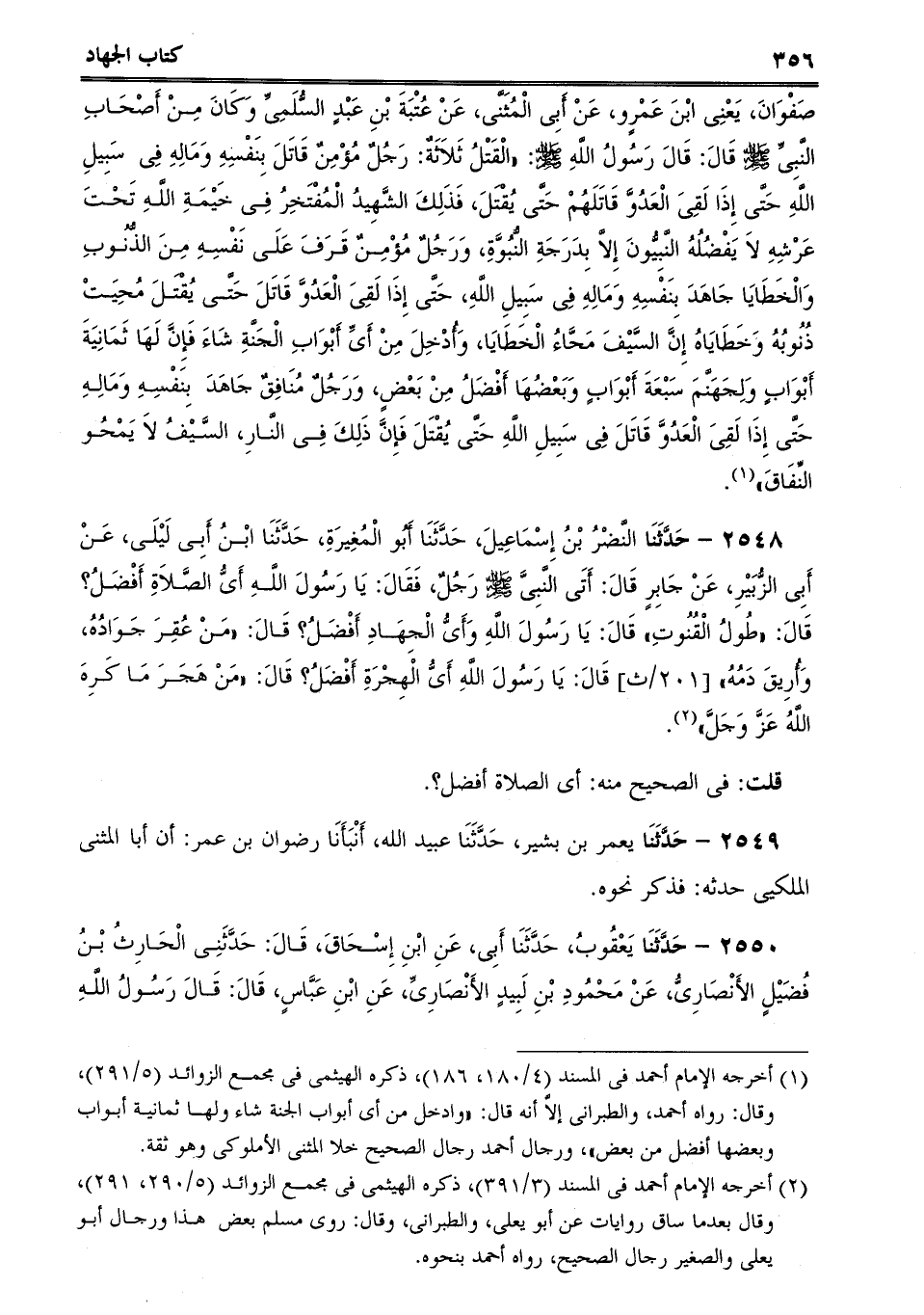 2548 - حَدَّثَنَا النَّضْرُ بْنُ إِسْمَاعِيلَ، حَدَّثَنَا أَبُو الْمُغِيرَةِ، حَدَّثَنَا ابْنُ أَبِى لَيْلَى، عَنْ أَبِى الزُّبَيْرِ، عَنْ جَابِرٍ قَالَ: أَتَى النَّبِىَّ صلى الله عليه وسلم رَجُلٌ، فَقَالَ: يَا رَسُولَ اللَّهِ أَىُّ الصَّلاَةِ أَفْضَلُ؟ قَالَ: "طُولُ الْقُنُوتِ قَالَ: يَا رَسُولَ اللَّهِ وَأَىُّ الْجِهَادِ أَفْضَلُ؟ قَالَ: "مَنْ عُقِرَ جَوَادُهُ، وَأُرِيقَ دَمُهُ [