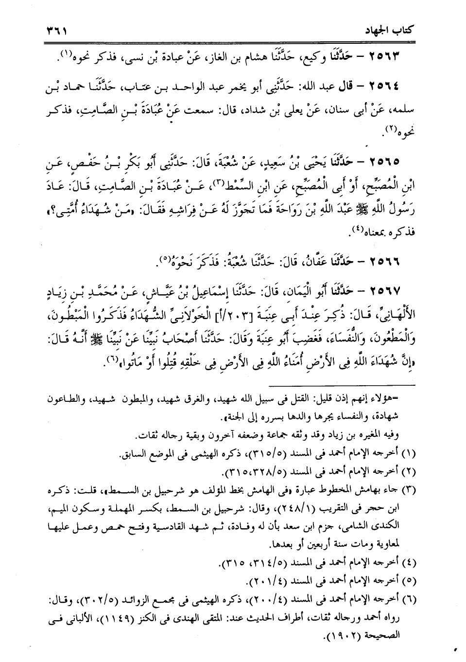 2565 - حَدَّثَنَا يَحْيَى بْنُ سَعِيدٍ، عَنْ شُعْبَةَ، قَالَ: حَدَّثَنِى أَبُو بَكْرِ بْنُ حَفْصٍ، عَنِ ابْنِ الْمُصَبِّحِ، أَوْ أَبِى الْمُصَبِّحِ، عَنِ ابْنِ السِّمْط، عَنْ عُبَادَةَ بْنِ الصَّامِتِ، قَالَ: عَادَ رَسُولُ اللَّهِ صلى الله عليه وسلم عَبْدَ اللَّهِ بْنَ رَوَاحَةَ فَمَا تَجَوَّزَ لَهُ عَنْ فِرَاشِهِ فَقَالَ: "مَنْ شُهَدَاءُ أُمَّتِى؟ فذكره بمعناه.