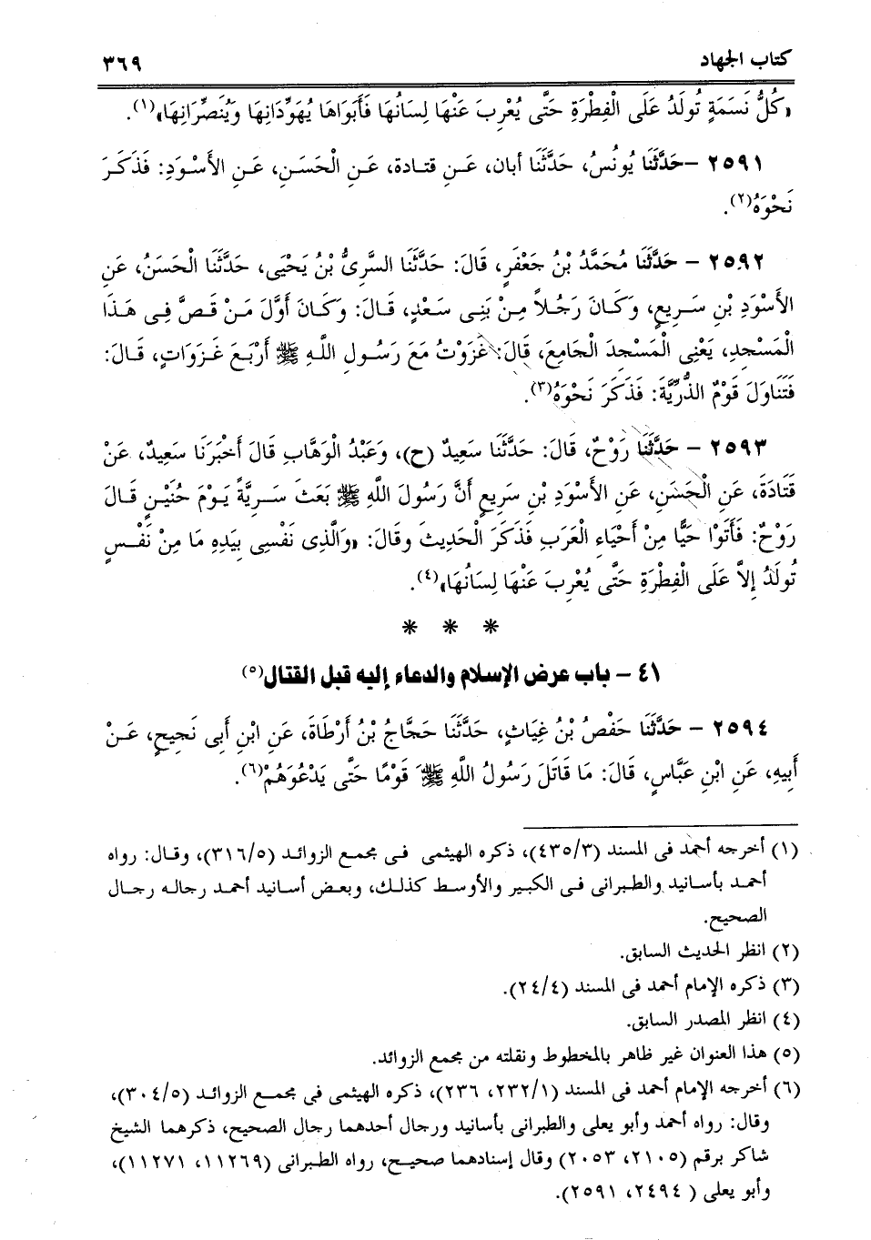 2593 - حَدَّثَنَا رَوْحٌ، قَالَ: حَدَّثَنَا سَعِيدٌ (ح) ، وَعَبْدُ الْوَهَّابِ قَالَ أَخْبَرَنَا سَعِيدٌ، عَنْ قَتَادَةَ، عَنِ الْحَسَنِ، عَنِ الأَسْوَدِ بْنِ سَرِيعٍ أَنَّ رَسُولَ اللَّهِ صلى الله عليه وسلم بَعَثَ سَرِيَّةً يَوْمَ حُنَيْنٍ قَالَ رَوْحٌ: فَأَتَوْا حَيًّا مِنْ أَحْيَاءِ الْعَرَبِ فَذَكَرَ الْحَدِيثَ وقَالَ: "وَالَّذِى نَفْسِى بِيَدِهِ مَا مِنْ نَفْسٍ تُولَدُ إِلاَّ عَلَى الْفِطْرَةِ حَتَّى يُعْرِبَ عَنْهَا لِسَانُهَا.