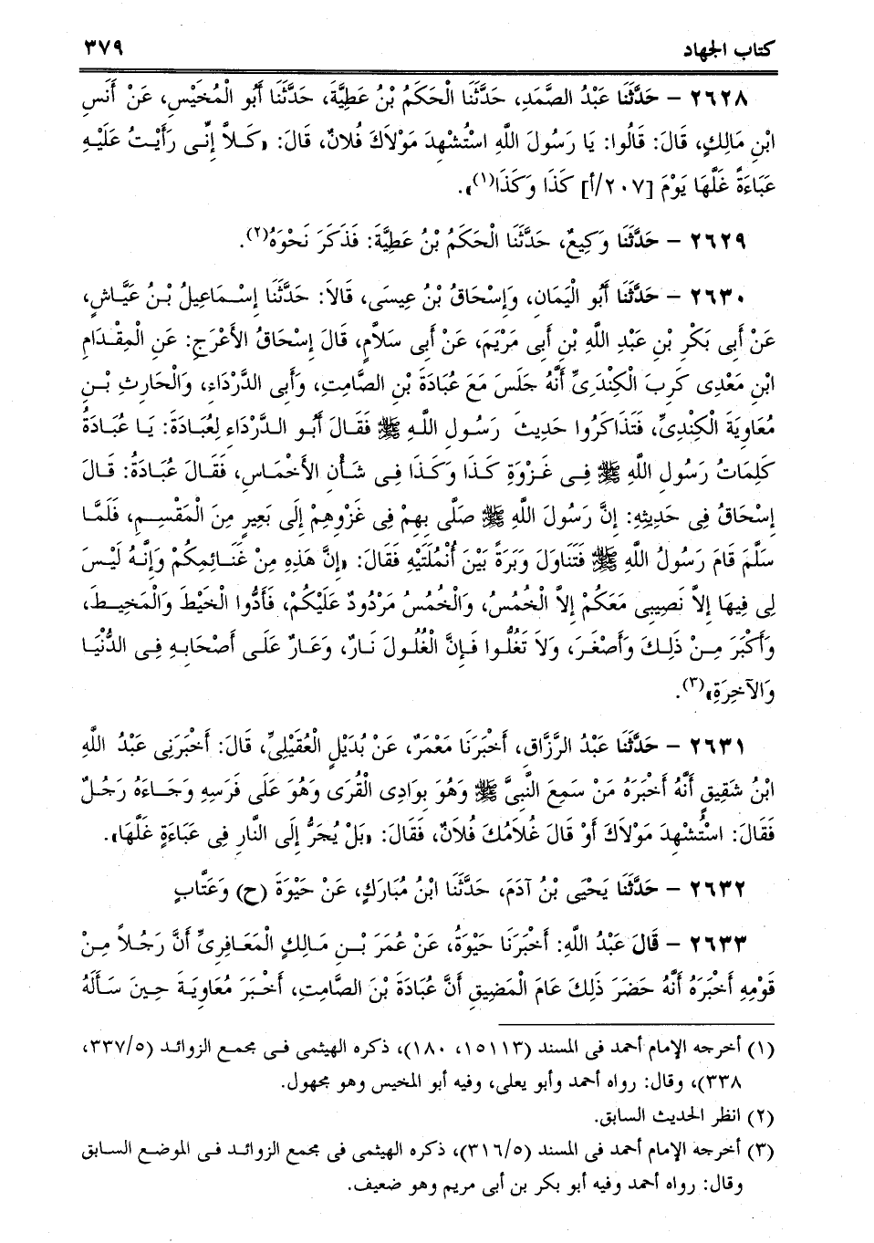 2633 - قَالَ عَبْدُ اللَّهِ: أَخْبَرَنَا حَيْوَةُ، عَنْ عُمَرَ بْنِ مَالِكٍ الْمَعَافِرِىِّ أَنَّ رَجُلاً مِنْ قَوْمِهِ أَخْبَرَهُ أَنَّهُ حَضَرَ ذَلِكَ عَامَ الْمَضِيقِ أَنَّ عُبَادَةَ بْنَ الصَّامِتِ، أَخْبَرَ مُعَاوِيَةَ حِينَ سَأَلَه -[380]- ُ عَنِ الرَّجُلِ الَّذِى سَأَلَ النَّبِىَّ صلى الله عليه وسلم عِقَالاً قَبْلَ أَنْ يَقْسِمَ فَقَالَ النَّبِىُّ صلى الله عليه وسلم: "اتْرُكْهُ حَتَّى يُقْسَمَ ثُمَّ إِنْ شِئْتَ أَعْطَيْنَاكَ عِقَالاً وَإِنْ شِئْتَ أَعْطَيْنَاكَ مِرَارًا.