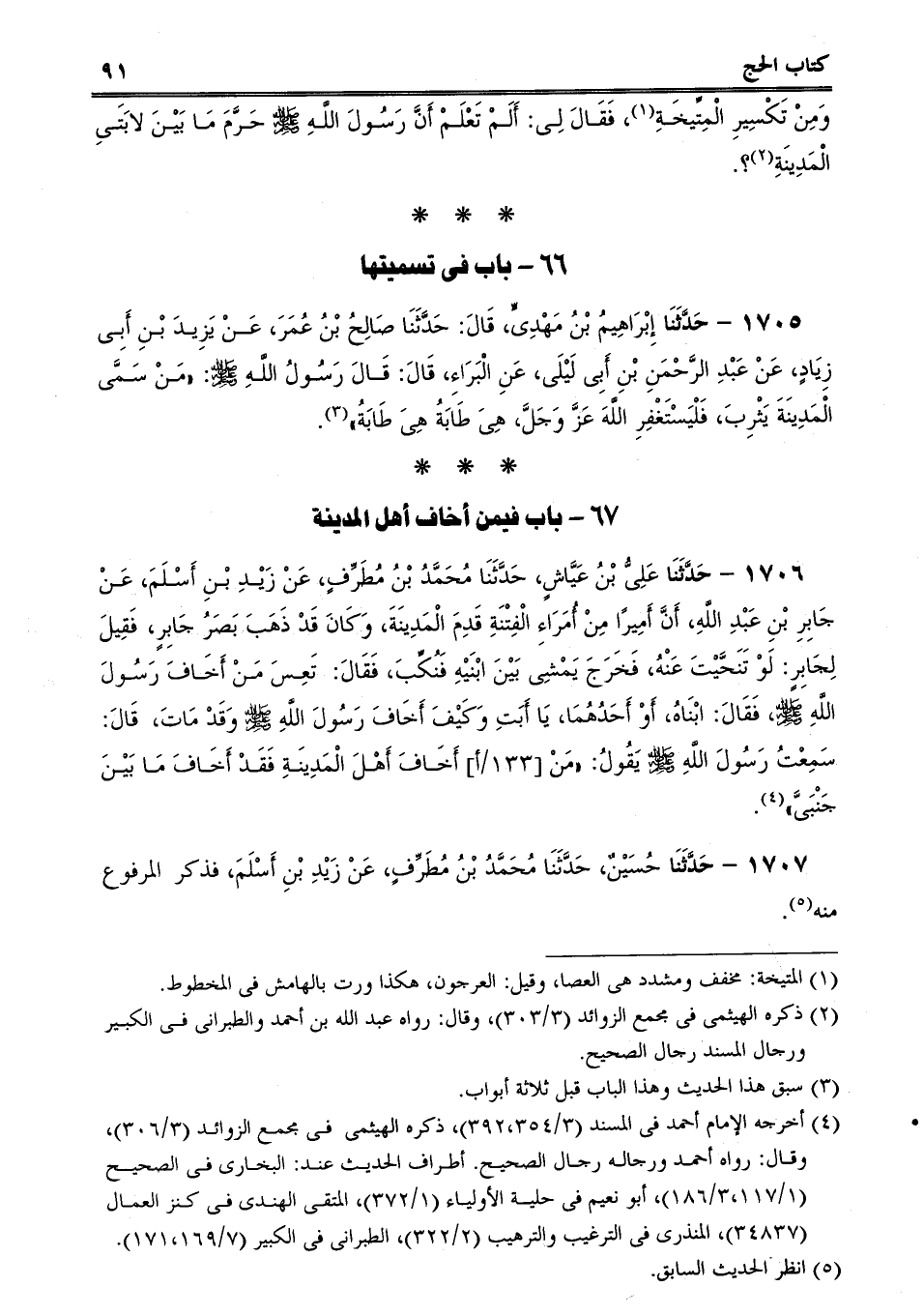 1706 - حَدَّثَنَا عَلِىُّ بْنُ عَيَّاشٍ، حَدَّثَنَا مُحَمَّدُ بْنُ مُطَرِّفٍ، عَنْ زَيْدِ بْنِ أَسْلَمَ، عَنْ جَابِرِ بْنِ عَبْدِ اللَّهِ، أَنَّ أَمِيرًا مِنْ أُمَرَاءِ الْفِتْنَةِ قَدِمَ الْمَدِينَةَ، وَكَانَ قَدْ ذَهَبَ بَصَرُ جَابِرٍ، فَقِيلَ لِجَابِرٍ: لَوْ تَنَحَّيْتَ عَنْهُ، فَخَرَجَ يَمْشِى بَيْنَ ابْنَيْهِ فَنُكِّبَ، فَقَالَ: تَعِسَ مَنْ أَخَافَ رَسُولَ اللَّهِ صلى الله عليه وسلم، فَقَالَ: ابْنَاهُ، أَوْ أَحَدُهُمَا، يَا أَبَتِ وَكَيْفَ أَخَافَ رَسُولَ اللَّهِ صلى الله عليه وسلم وَقَدْ مَاتَ، قَالَ: سَمِعْتُ رَسُولَ اللَّهِ صلى الله عليه وسلم يَقُولُ: "مَنْ أَخَافَ أَهْلَ الْمَدِينَةِ فَقَدْ أَخَافَ مَا بَيْنَ جَنْبَىَّ.