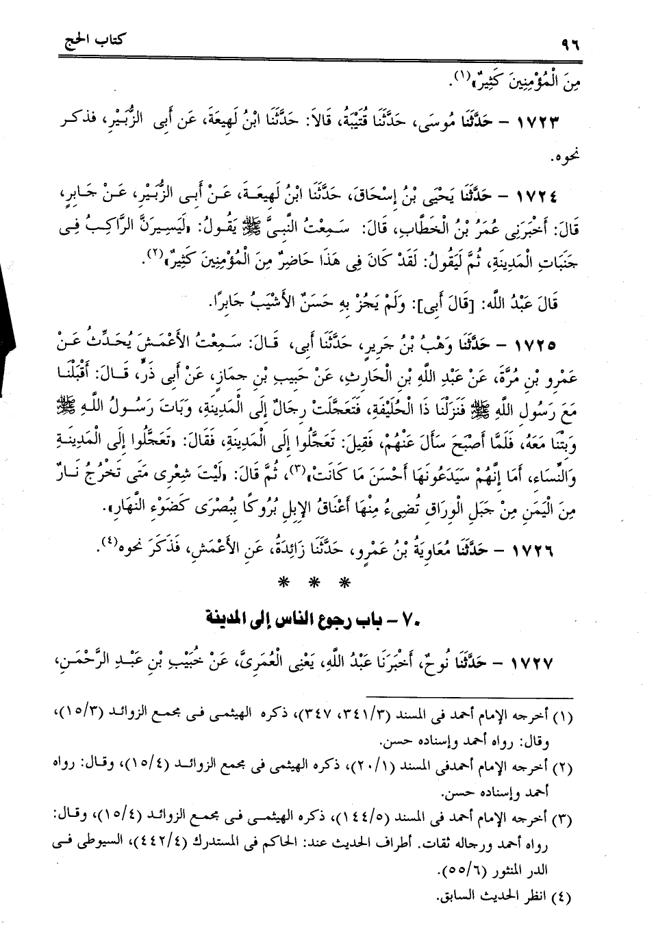 1725 - حَدَّثَنَا وَهْبُ بْنُ جَرِيرٍ، حَدَّثَنَا أَبِى، قَالَ: سَمِعْتُ الأَعْمَشَ يُحَدِّثُ عَنْ عَمْرِو بْنِ مُرَّةَ، عَنْ عَبْدِ اللَّهِ بْنِ الْحَارِثِ، عَنْ حَبِيبِ بْنِ جِمَازٍ، عَنْ أَبِى ذَرٍّ، قَالَ: أَقْبَلْنَا مَعَ رَسُولِ اللَّهِ صلى الله عليه وسلم فَنَزَلْنَا ذَا الْحُلَيْفَةِ، فَتَعَجَّلَتْ رِجَالٌ إِلَى الْمَدِينَةِ، وَبَاتَ رَسُولُ اللَّهِ صلى الله عليه وسلم وَبِتْنَا مَعَهُ، فَلَمَّا أَصْبَحَ سَأَلَ عَنْهُمْ، فَقِيلَ: تَعَجَّلُوا إِلَى الْمَدِينَةِ، فَقَالَ: "تَعَجَّلُوا إِلَى الْمَدِينَةِ وَالنِّسَاءِ، أَمَا إِنَّهُمْ سَيَدَعُونَهَا أَحْسَنَ مَا كَانَتْ، ثُمَّ قَالَ: "لَيْتَ شِعْرِى مَتَى تَخْرُجُ نَارٌ مِنَ الْيَمَنِ مِنْ جَبَلِ الْوِرَاقِ تُضِىءُ مِنْهَا أَعْنَاقُ الإِبِلِ بُرُوكًا بِبُصْرَى كَضَوْءِ النَّهَارِ.