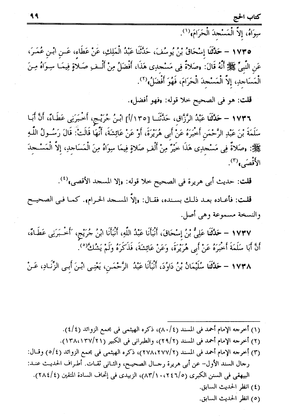 قلت: فأعاده بعد ذلك بسنده، فقال: "إلاَّ المسجد الحرام. كما فى الصحيح والنسخة مسموعة وهى أصل.