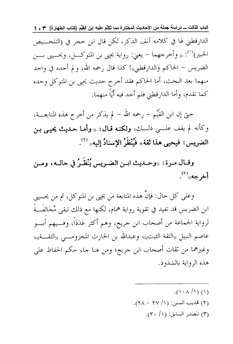 حتى إن ابن القَيِّم - رحمه الله - لم يذكر من أخرج هذه المتابعة، وكأنه لم يقف على ذلك، ولكنه قال: "وأما حديث يحيى بن الضريس: فيحيى هذا ثقة، فَيُنْظَرُ الإسنادُ إليه"2.