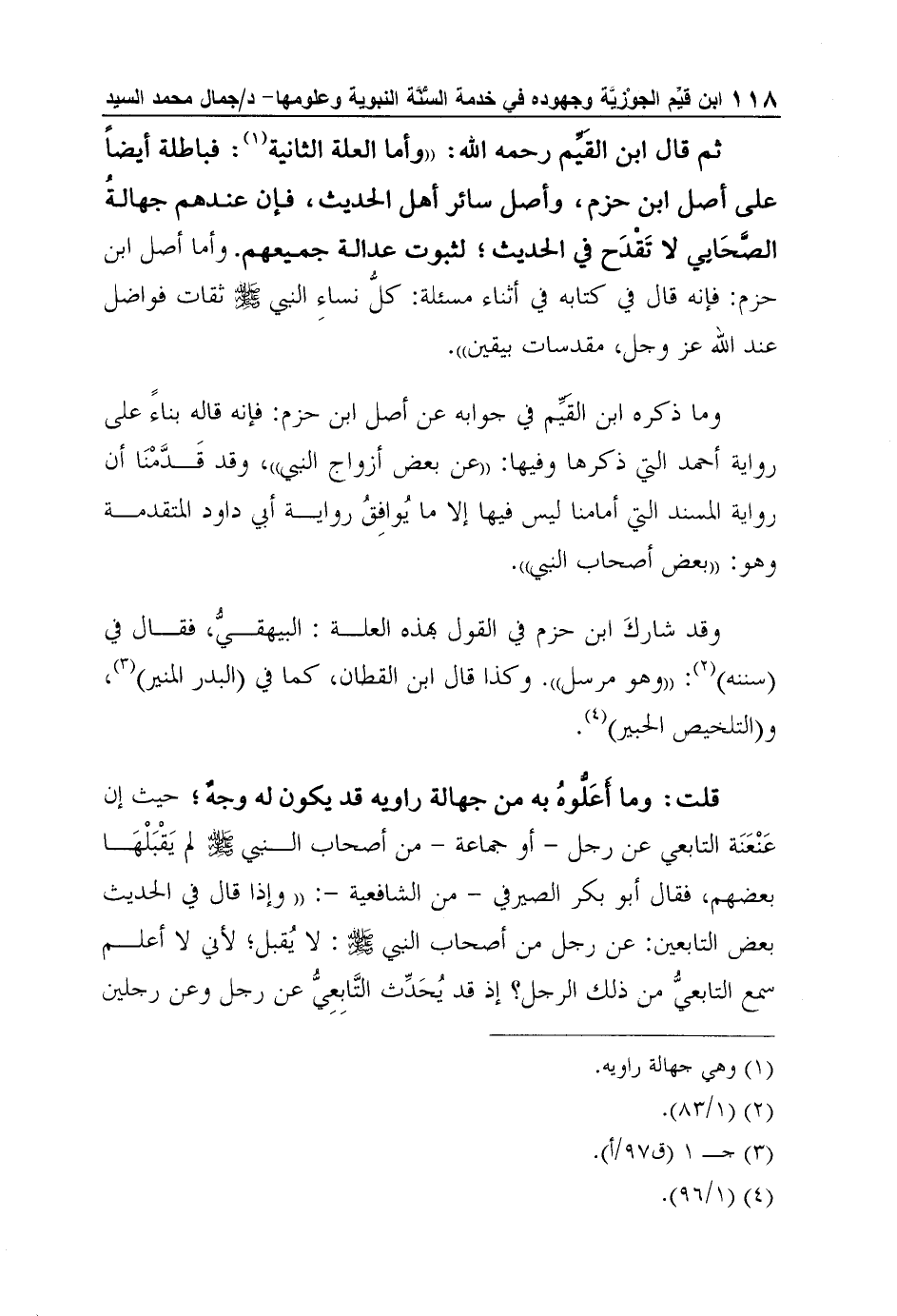 ثم قال ابن القَيِّم رحمه الله: "وأما العلة الثانية1: فباطلة أيضاً على أصل ابن حزم، وأصل سائر أهل الحديث، فإن عندهم جهالةُ الصَّحَابِي لا تَقْدَح في الحديث؛ لثبوت عدالة جميعهم. وأما أصل ابن حزم: فإنه قال في كتابه في أثناء مسئلة: كلُّ نساءِ النبي صلى الله عليه وسلم ثقات فواضل عند الله عز وجل، مقدسات بيقين".
