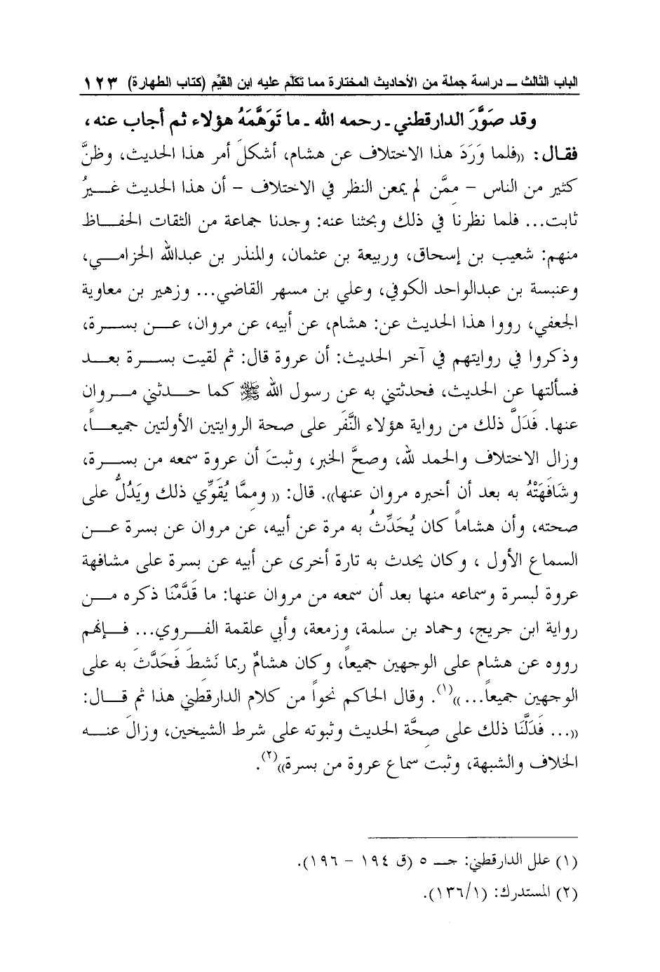 وقد صَوَّرَ الدارقطني - رحمه الله - ما تَوَهَّمَهُ هؤلاء ثم أجاب عنه، فقال: "فلما وَرَدَ هذا الاختلاف عن هشام، أشكلَ أمر هذا الحديث، وظنَّ كثير من الناس - مِمَّن لم يمعن النظر في الاختلاف - أن هذا الحديث غيرُ ثابت ... فلما نظرنا في ذلك وبحثنا عنه: وجدنا جماعة من الثقات الحفاظ منهم: شعيب بن إسحاق، وربيعة بن عثمان، والمنذر بن عبد الله الحزامي، وعنبسة بن عبد الواحد الكوفي، وعلي بن مسهر القاضي ... وزهير بن معاوية الجعفي، رووا هذا الحديث عن: هشام، عن أبيه، عن مروان، عن بسرة، وذكروا في روايتهم في آخر الحديث: أن عروة قال: ثم لقيت بسرة بعد فسألتها عن الحديث، فحدثتني به عن رسول الله صلى الله عليه وسلم كما حدثني مروان عنها. فَدَلَّ ذلك من رواية هؤلاء النَّفَر على صحة الروايتين الأولتين جميعاً، وزال الاختلاف والحمد لله، وصحَّ الخبر، وثبتَ أن عروة سمعه من بسرة، وشَافَهَتْهُ به بعد أن أخبره مروان عنها". قال: "ومِمَّا يُقَوِّي ذلك ويَدُلُّ على صحته، وأن هشاماً كان يُحَدِّثُ به مرة عن أبيه، عن مروان عن بسرة عن السماع الأول، وكان يحدث به تارة أخرى عن أبيه عن بسرة على مشافهة عروة لبسرة وسماعه منها بعد أن سمعه من مروان عنها: ما قَدَّمْنَا ذكره من رواية ابن جريج، وحماد بن سلمة، وزمعة، وأبي علقمة الفروي ... فإنهم رووه عن هشام على الوجهين جميعاً، وكان هشامٌ ربما نَشِطَ فَحَدَّثَ به على الوجهين جميعاً ... "1. وقال الحاكم نحواً من كلام الدارقطني هذا ثم قال: " ... فَدَلَّنَا ذلك على صِحَّة الحديث وثبوته على شرط الشيخين، وزالَ عنه الخلاف والشبهة، وثبت سماع عروة من بسرة"2.