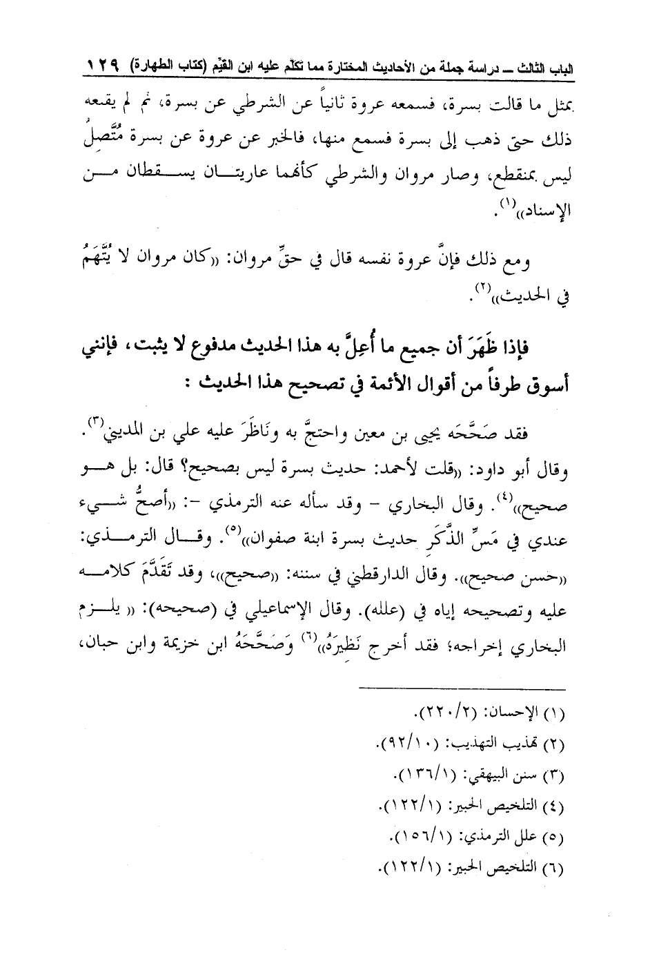 فقد صَحَّحَه يحيى بن معين واحتجَّ به ونَاظَرَ عليه علي بن المديني3. وقال أبو داود: "قلت لأحمد: حديث بسرة ليس بصحيح؟ قال: بل هو صحيح"4. وقال البخاري - وقد سأله عنه الترمذي -: "أصحُّ شيء عندي في مَسِّ الذَّكَرِ حديث بسرة ابنة صفوان"5. وقال الترمذي: "حسن صحيح". وقال الدارقطني في سننه: "صحيح"، وقد تَقَدَّمَ كلامه عليه وتصحيحه إياه في (علله) . وقال الإسماعيلي في (صحيحه) : "يلزم البخاري إخراجه؛ فقد أخرج نَظِيرَهُ"6 وَصَحَّحَهُ ابن خزيمة وابن حبان،