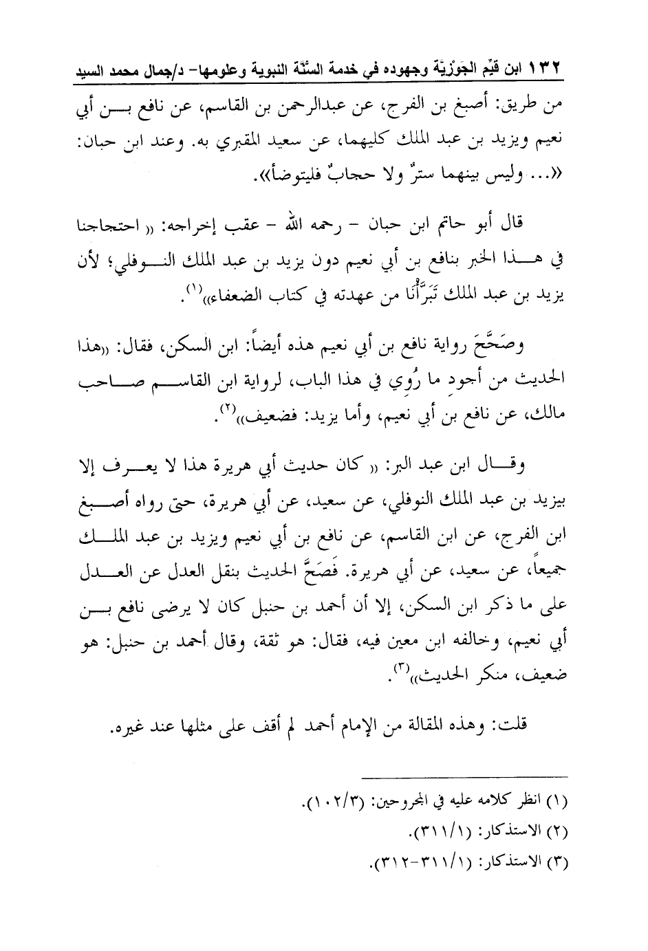 وقال ابن عبد البر: "كان حديث أبي هريرة هذا لا يعرف إلا بيزيد بن عبد الملك النوفلي، عن سعيد، عن أبي هريرة، حتى رواه أصبغ ابن الفرج، عن ابن القاسم، عن نافع بن أبي نعيم ويزيد بن عبد الملك جميعاً، عن سعيد، عن أبي هريرة. فَصَحَّ الحديث بنقل العدل عن العدل على ما ذكر ابن السكن، إلا أن أحمد بن حنبل كان لا يرضى نافع بن أبي نعيم، وخالفه ابن معين فيه، فقال: هو ثقة، وقال أحمد بن حنبل: هو ضعيف، منكر الحديث"3.