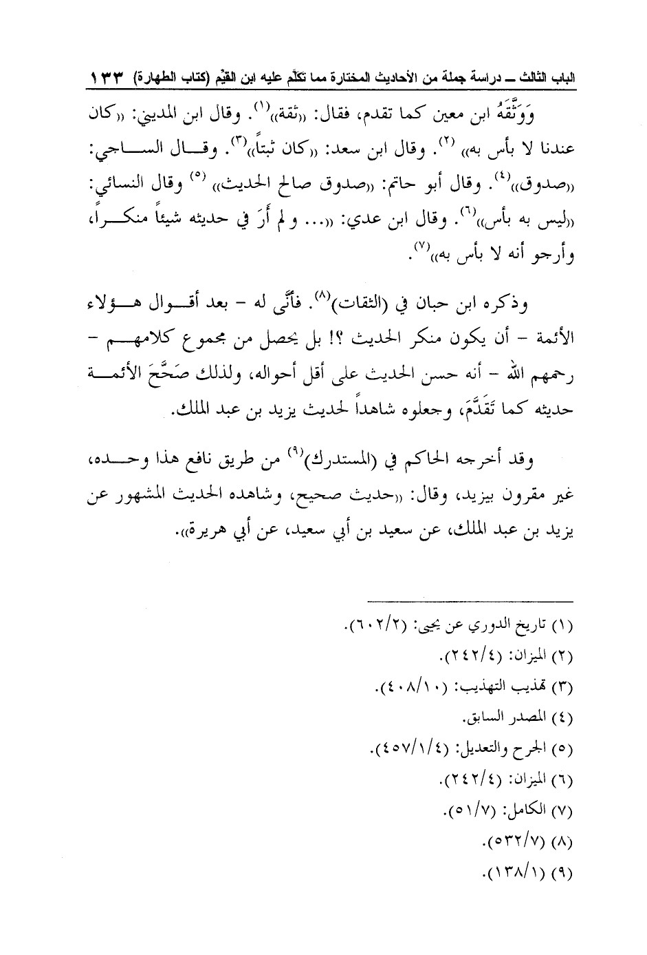 وذكره ابن حبان في (الثقات) 8. فأنَّى له - بعد أقوال هؤلاء الأئمة - أن يكون منكر الحديث؟! بل يحصل من مجموع كلامهم - رحمهم الله - أنه حسن الحديث على أقل أحواله، ولذلك صَحَّحَ الأئمة حديثه كما تَقَدَّمَ، وجعلوه شاهداً لحديث يزيد بن عبد الملك.
