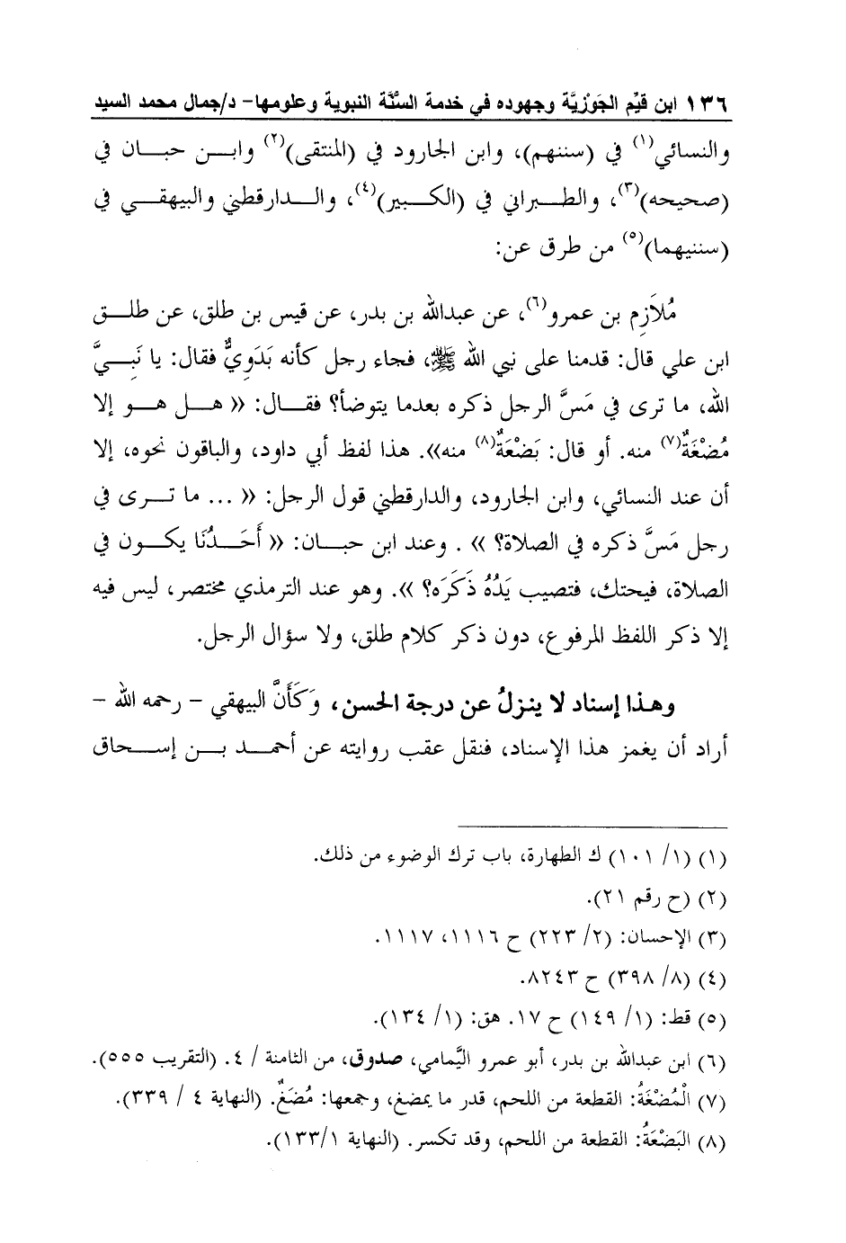 مُلاَزِم بن عمرو6، عن عبد الله بن بدر، عن قيس بن طلق، عن طلق ابن علي قال: قدمنا على نبي الله صلى الله عليه وسلم، فجاء رجل كأنه بَدَوِيٌّ فقال: يا نَبِيَّ الله، ما ترى في مَسَّ الرجل ذكره بعدما يتوضأ؟ فقال: "هل هو إلا مُضْغَةٌ7 منه. أو قال: بَضْعَةٌ8 منه". هذا لفظ أبي داود، والباقون نحوه، إلا أن عند النسائي، وابن الجارود، والدارقطني قول الرجل: " ... ما ترى في رجل مَسَّ ذكره في الصلاة؟ ". وعند ابن حبان: "أَحَدُنَا يكون في الصلاة، فيحتك، فتصيب يَدُهُ ذَكَرَه؟ ". وهو عند الترمذي مختصر، ليس فيه إلا ذكر اللفظ المرفوع، دون ذكر كلام طلق، ولا سؤال الرجل.