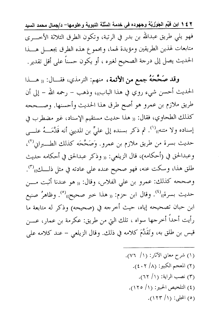 وقد صَحَّحَهُ جمع من الأئمة، منهم: الترمذي، فقال: "هذا الحديث أحسن شيء روي في هذا الباب"، وذهب - رحمه الله - إلى أن طريق ملازم بن عمرو هو أصح طرق هذا الحديث وأحسنها. وصححه كذلك الطحاوي، فقال: "هذا حديث مستقيم الإسناد، غير مضطرب في إسناده ولا متنه"1. ثم ذكر بسنده إلى عليِّ بن المديني أنه قَدَّمَهُ على حديث بسرة من طريق ملازم بن عمرو. وَصَحَّحَه كذلك الطبراني2، وعبد الحق في (أحكامه) ، قال الزيلعي: "وذكر عبد الحق في أحكامه حديث طلق هذا، وسكت عنه، فهو صحيح عنده على عادته في مثل ذلك"3. وصححه كذلك: عمرو بن علي الفلاس، وقال: "هو عندنا أثبت من حديث بسرة"4. وقال ابن حزم: "هذا خبر صحيح"5. وظاهرُ صنيع ابن حبان تصحيحه إياه، حيث أخرجه في (صحيحه) وذكر له متابعة ما رأيت أحداً أخرجها سواه، تلك التي من طريق: عكرمة بن عمار، عن قيس بن طلق به، وتَقَدَّمَ كلامه في ذلك. وقال الزيلعي - عند كلامه على