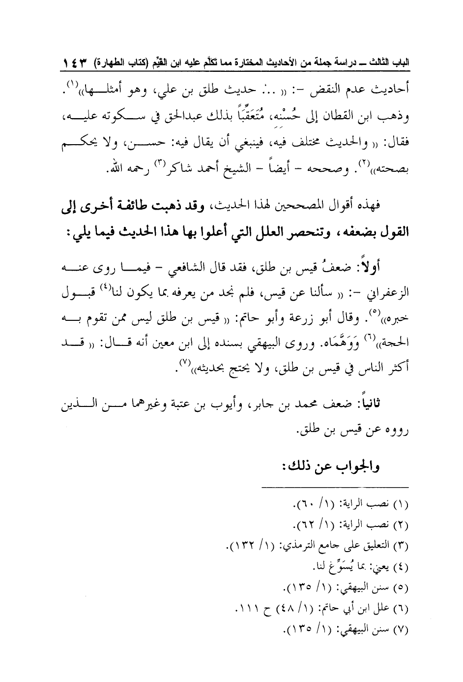 أولاً: ضعفُ قيس بن طلق، فقد قال الشافعي - فيما روى عنه الزعفراني -: "سألنا عن قيس، فلم نجد من يعرفه بما يكون لنا4 قبول خبره"5. وقال أبو زرعة وأبو حاتم: "قيس بن طلق ليس ممن تقوم به الحجة"6 وَوَهَّمَاه. وروى البيهقي بسنده إلى ابن معين أنه قال: "قد أكثر الناس في قيس بن طلق، ولا يحتج بحديثه"7.