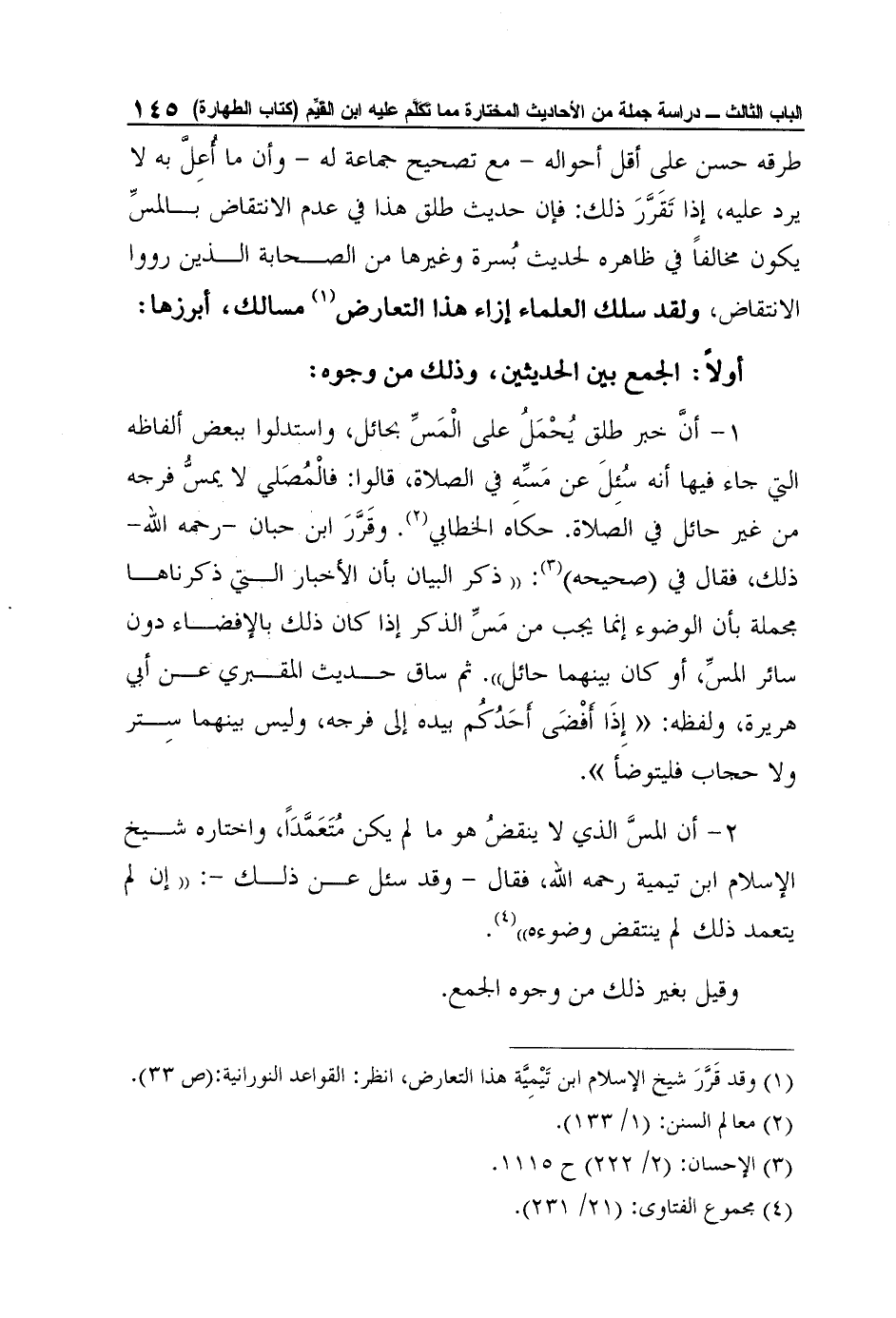 طرقه حسن على أقل أحواله - مع تصحيح جماعة له - وأن ما أُعِلَّ به لا يرد عليه، إذا تَقَرَّرَ ذلك: فإن حديث طلق هذا في عدم الانتقاض بالمسِّ يكون مخالفاً في ظاهره لحديث بُسرة وغيرها من الصحابة الذين رووا الانتقاض، ولقد سلك العلماء إزاء هذا التعارض1 مسالك، أبرزها: