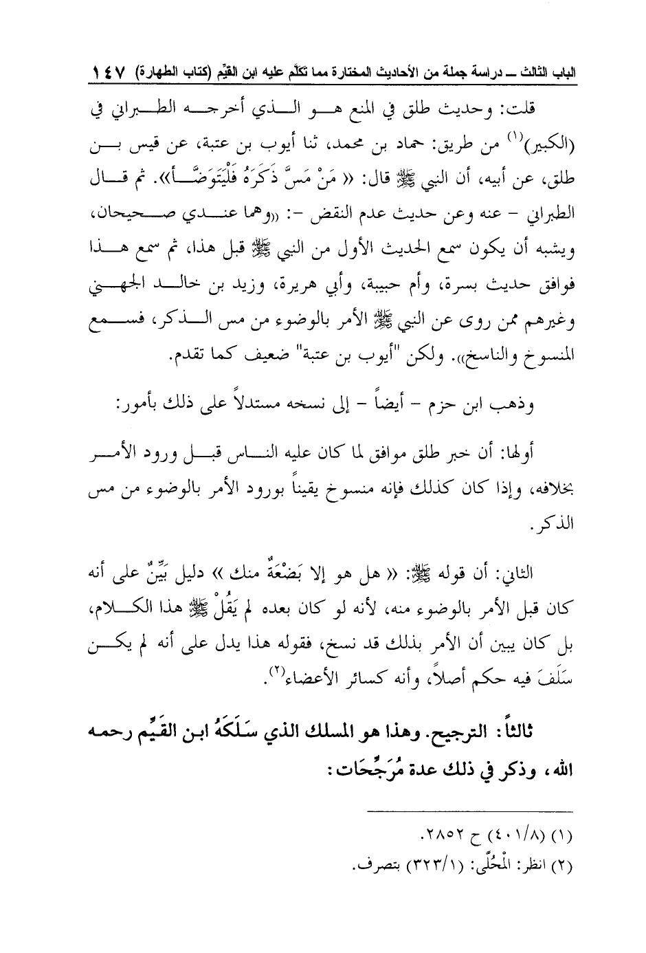 قلت: وحديث طلق في المنع هو الذي أخرجه الطبراني في (الكبير) 1 من طريق: حماد بن محمد، ثنا أيوب بن عتبة، عن قيس بن طلق، عن أبيه، أن النبي صلى الله عليه وسلم قال: "مَنْ مَسَّ ذَكَرَهُ فَلْيَتَوَضَّأ". ثم قال الطبراني - عنه وعن حديث عدم النقض -: "وهما عندي صحيحان، ويشبه أن يكون سمع الحديث الأول من النبي صلى الله عليه وسلم قبل هذا، ثم سمع هذا فوافق حديث بسرة، وأم حبيبة، وأبي هريرة، وزيد بن خالد الجهني وغيرهم ممن روى عن النبي صلى الله عليه وسلم الأمر بالوضوء من مس الذكر، فسمع المنسوخ والناسخ". ولكن "أيوب بن عتبة" ضعيف كما تقدم.