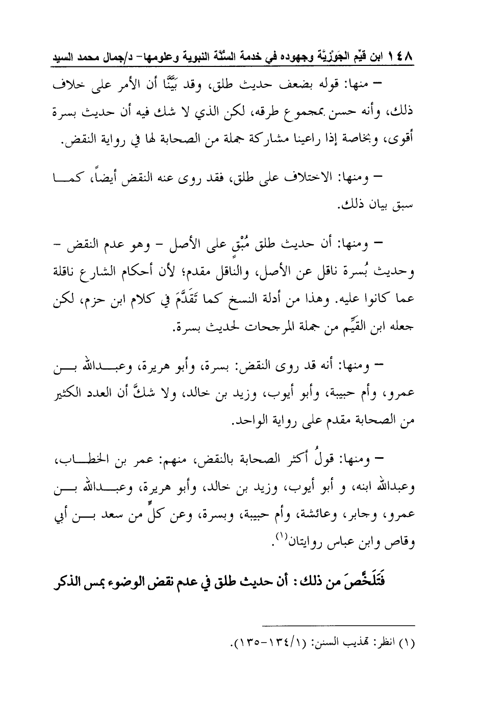 - منها: قوله بضعف حديث طلق، وقد بَيَّنَّا أن الأمر على خلاف ذلك، وأنه حسن بمجموع طرقه، لكن الذي لا شك فيه أن حديث بسرة أقوى، وبخاصة إذا راعينا مشاركة جملة من الصحابة لها في رواية النقض.