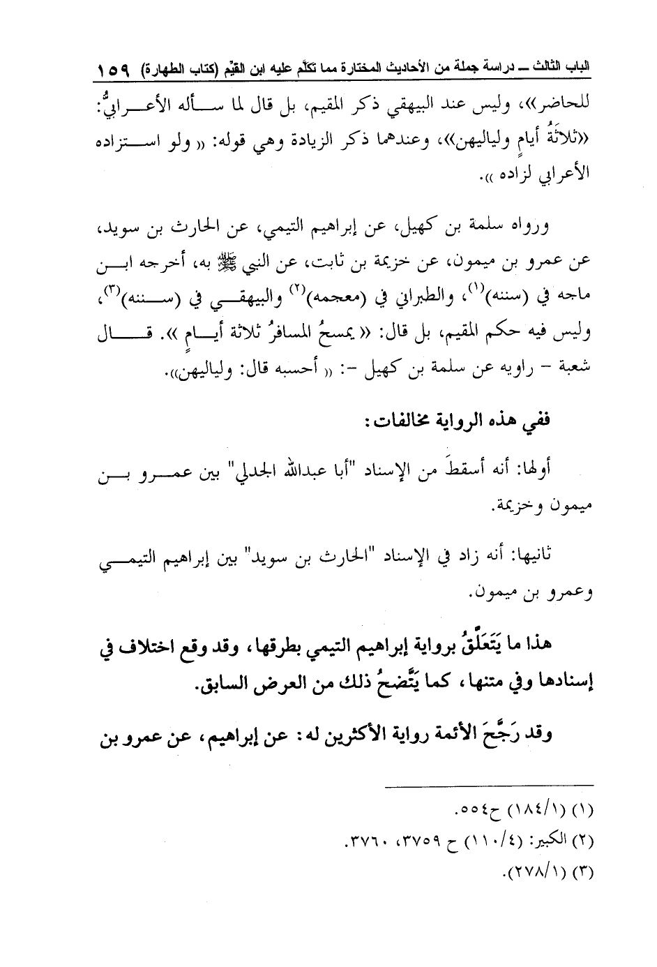 ورواه سلمة بن كهيل، عن إبراهيم التيمي، عن الحارث بن سويد، عن عمرو بن ميمون، عن خزيمة بن ثابت، عن النبي صلى الله عليه وسلم به، أخرجه ابن ماجه في (سننه) 1، والطبراني في (معجمه) 2 والبيهقي في (سننه) 3، وليس فيه حكم المقيم، بل قال: "يمسحُ المسافرُ ثلاثة أيامٍ". قال شعبة - راويه عن سلمة بن كهيل -: "أحسبه قال: ولياليهن".