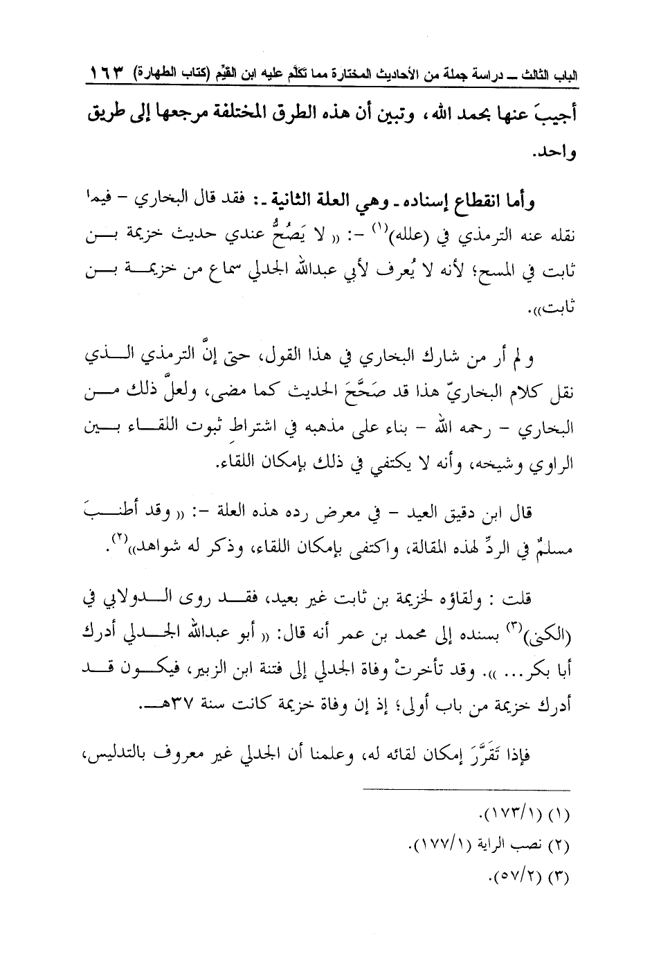 وأما انقطاع إسناده - وهي العلة الثانية -: فقد قال البخاري - فيما نقله عنه الترمذي في (علله) 1 -: "لا يَصُحُّ عندي حديث خزيمة بن ثابت في المسح؛ لأنه لا يُعرف لأبي عبد الله الجدلي سماع من خزيمة بن ثابت".