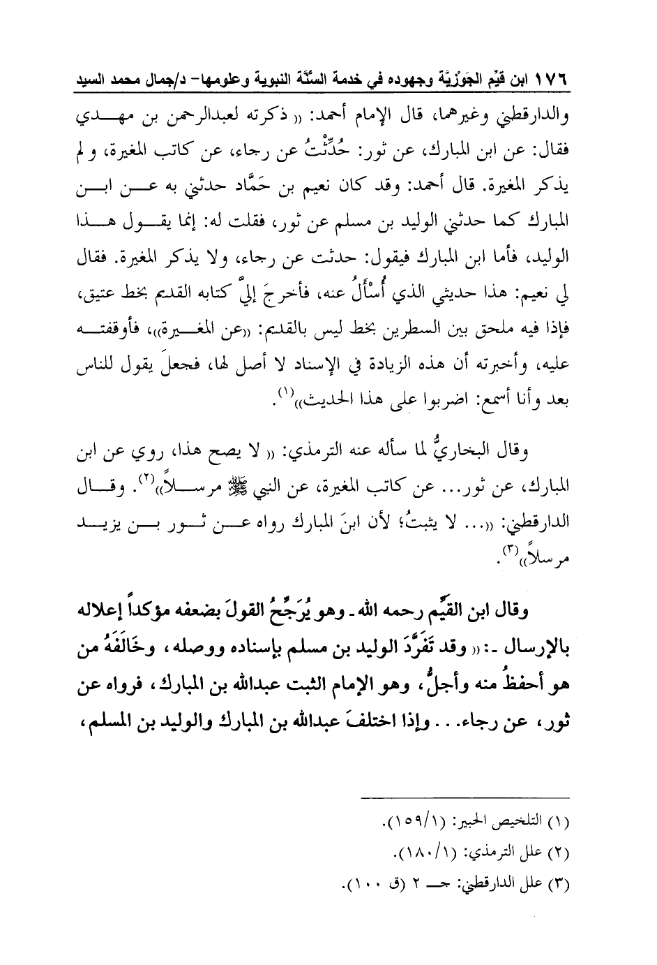 والدارقطني وغيرهما، قال الإمام أحمد: "ذكرته لعبد الرحمن بن مهدي فقال: عن ابن المبارك، عن ثور: حُدِّثْتُ عن رجاء، عن كاتب المغيرة، ولم يذكر المغيرة. قال أحمد: وقد كان نعيم بن حَمَّاد حدثني به عن ابن المبارك كما حدثني الوليد بن مسلم عن ثور، فقلت له: إنما يقول هذا الوليد، فأما ابن المبارك فيقول: حدثت عن رجاء، ولا يذكر المغيرة. فقال لي نعيم: هذا حديثي الذي أُسْأَلُ عنه، فأخرجَ إليَّ كتابه القديم بخط عتيق، فإذا فيه ملحق بين السطرين بخط ليس بالقديم: "عن المغيرة"، فأوقفته عليه، وأخبرته أن هذه الزيادة في الإسناد لا أصل لها، فجعلَ يقول للناس بعد وأنا أسمع: اضربوا على هذا الحديث"1.