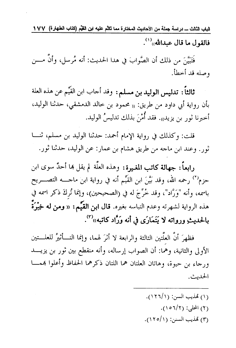 ثالثاً: تدليس الوليد بن مسلم: وقد أجاب ابن القَيِّم عن هذه العلة بأن رواية أبي داود من طريق: "محمود بن خالد الدمشقي، حدثنا الوليد، أخبرنا ثور بن يزيد". فقد أُمْنَ بذلك تدليسُ الوليد.
