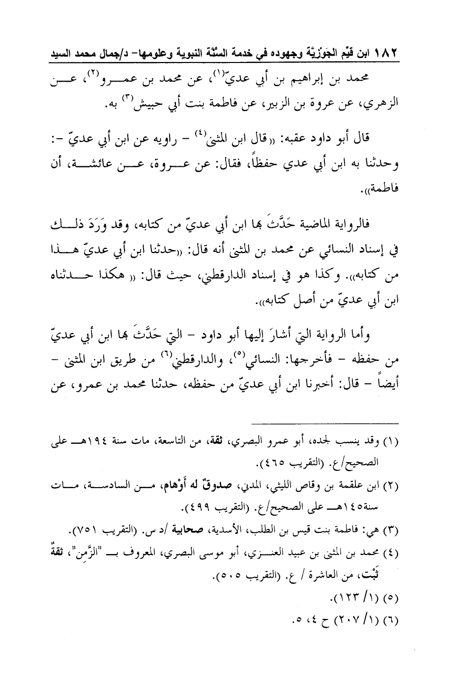 وأما الرواية التي أشارَ إليها أبو داود - التي حَدَّثَ بها ابن أبي عديّ من حفظه - فأخرجها: النسائي5، والدارقطني6 من طريق ابن المثنى - أيضاً - قال: أخبرنا ابن أبي عديّ من حفظه، حدثنا محمد بن عمرو، عن