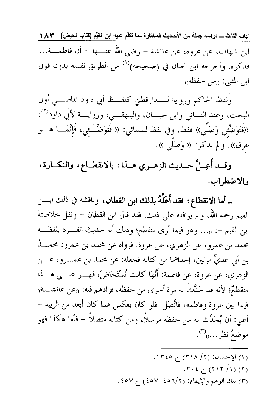 - أما الانقطاع: فقد أَعَلَّهُ بذلك ابن القطان، وناقشه في ذلك ابن القيم رحمه الله، ولم يوافقه على ذلك. فقد قال ابن القطان - ونقل خلاصته ابن القيم -: " ... وهو فيما أرى منقطع؛ وذلك أنه حديث انفرد بلفظه محمد بن عمرو، عن الزهري، عن عروة. فرواه عن محمد بن عمرو: محمدُ بن أبي عديٍّ مرتين، إحداهما من كتابه فجعله: عن محمد بن عمرو، عن الزهري، عن عروة، عن فاطمة: أَنَّهَا كانت تُسْتَحَاضُ، فهو على هذا منقطعٌ؛ لأنه قد حَدَّثَ به مرة أخرى من حفظه، فزادهم فيه: "عن عائشة" فيما بين عروة وفاطمة، فاتَّصَل. فلو كان بعكس هذا كان أبعد من الريبة - أعني: أن يُحَدِّث به من حفظه مرسلاً، ومن كتابه متصلاً - فأما هكذا فهو موضعُ نظر ... "3.